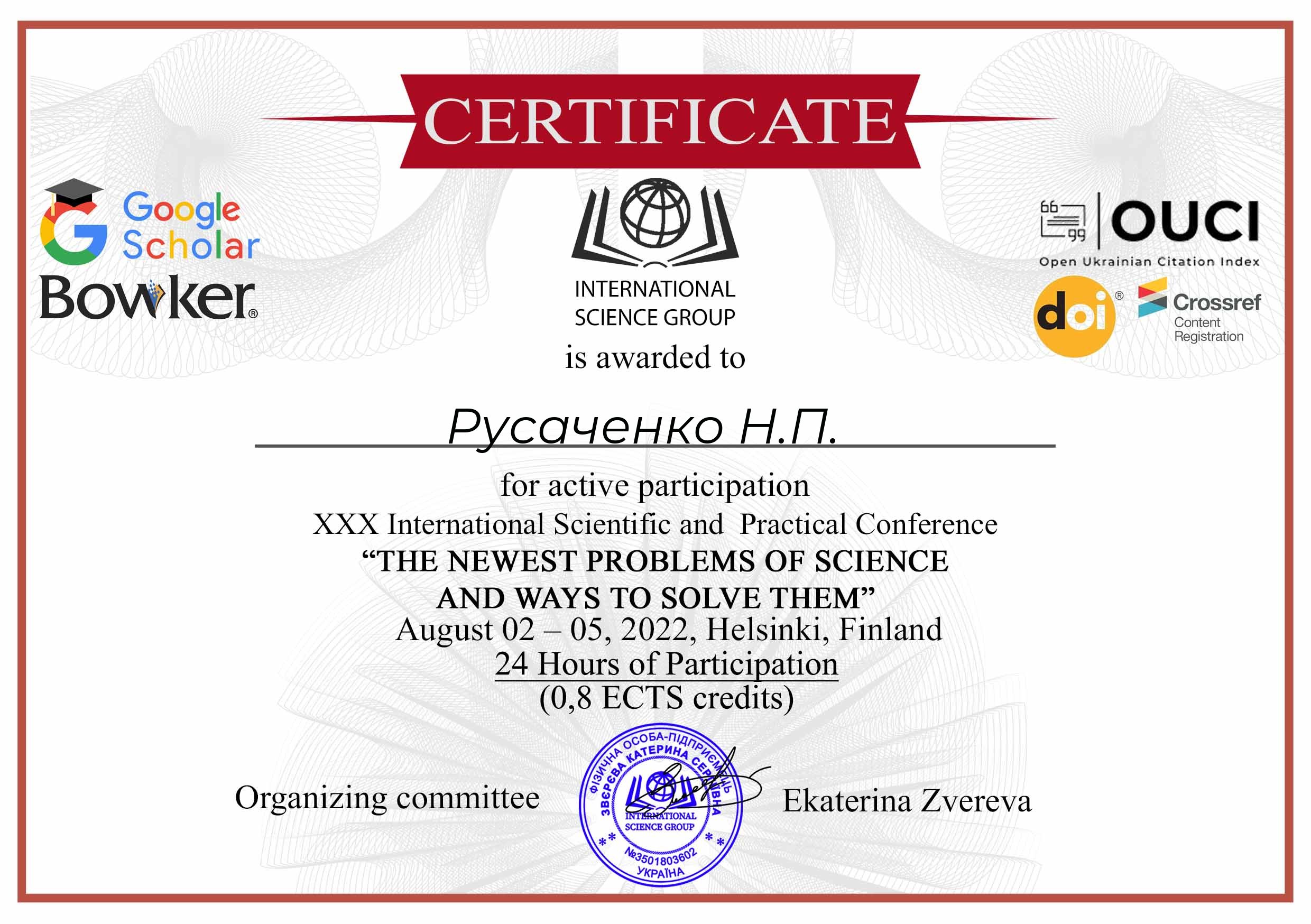 | 8249 | XXX Міжнародна науково-практична конференція «The newest problems of science and ways to solve them» | Семантико-граматична структура лемківських фразеологічних одиниць на позначення фізичних та психічних властивостей людини | Гельсінкі |