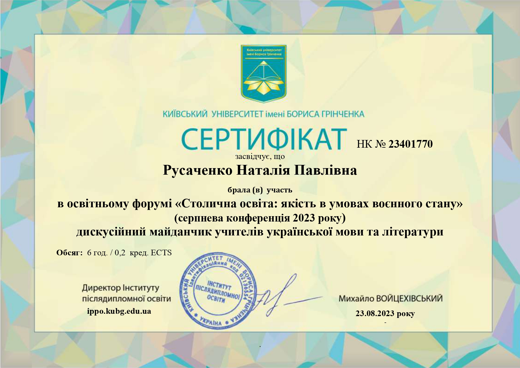 | 8201 | Професійно-орієнтований курс для науково-педагогічних та педагогічних працівників закладів вищої освіти | Інший модуль | Яцика -Журі ВНЗ _1 - 0015 (3).pdf | 01.03.2023 00:00 |