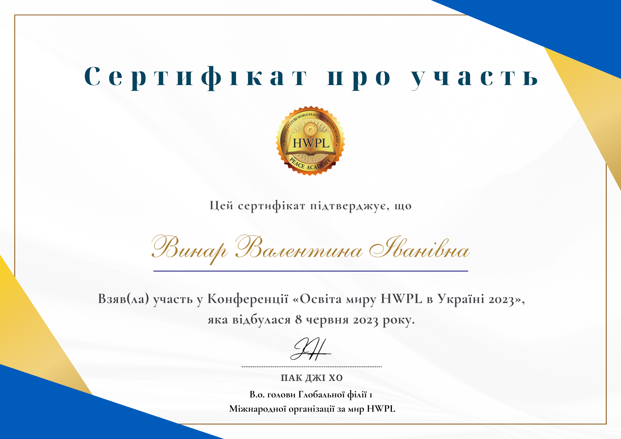 9404 «Освіта миру HWPL в Україні 2023» учасник конференції Onlaine document