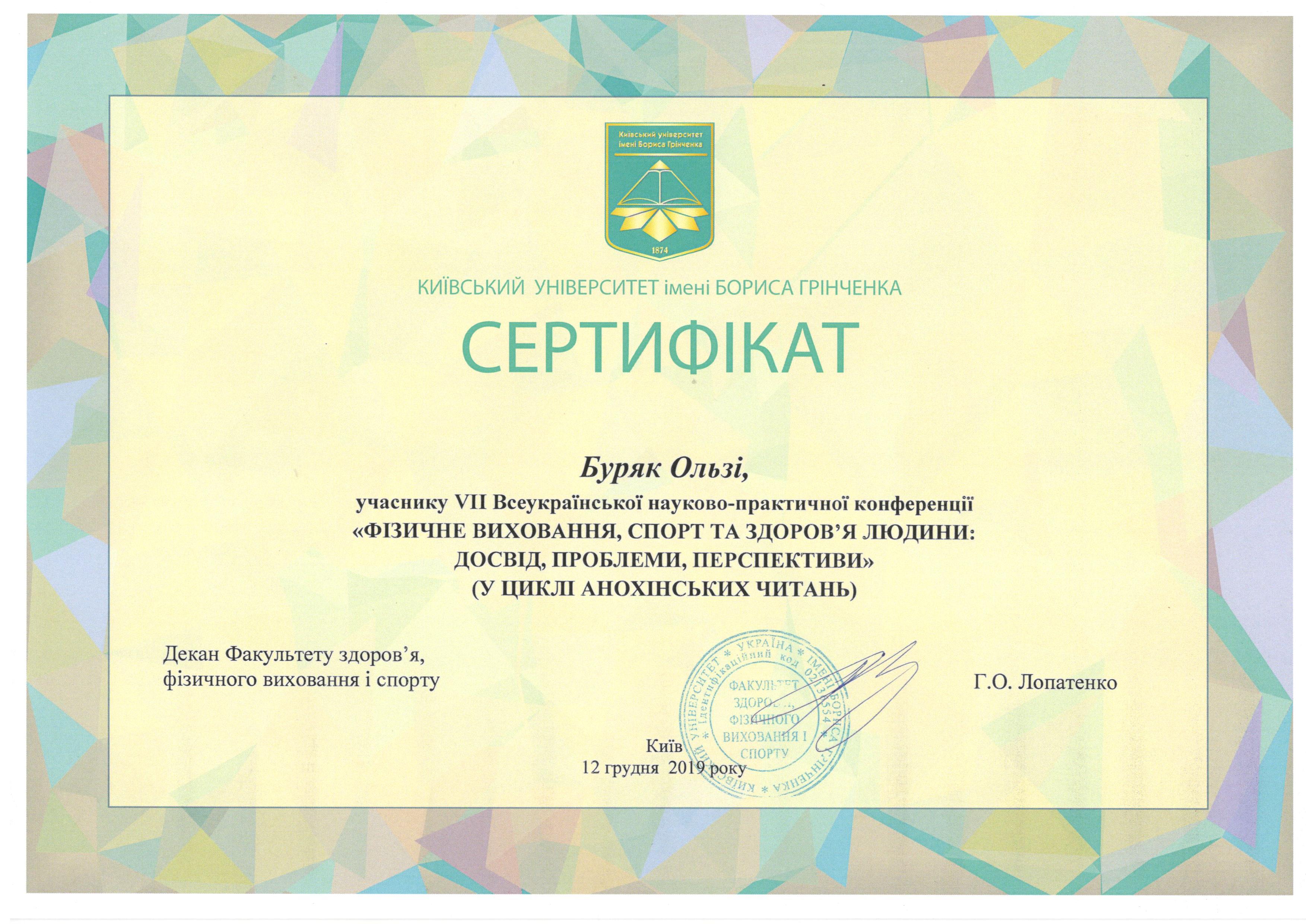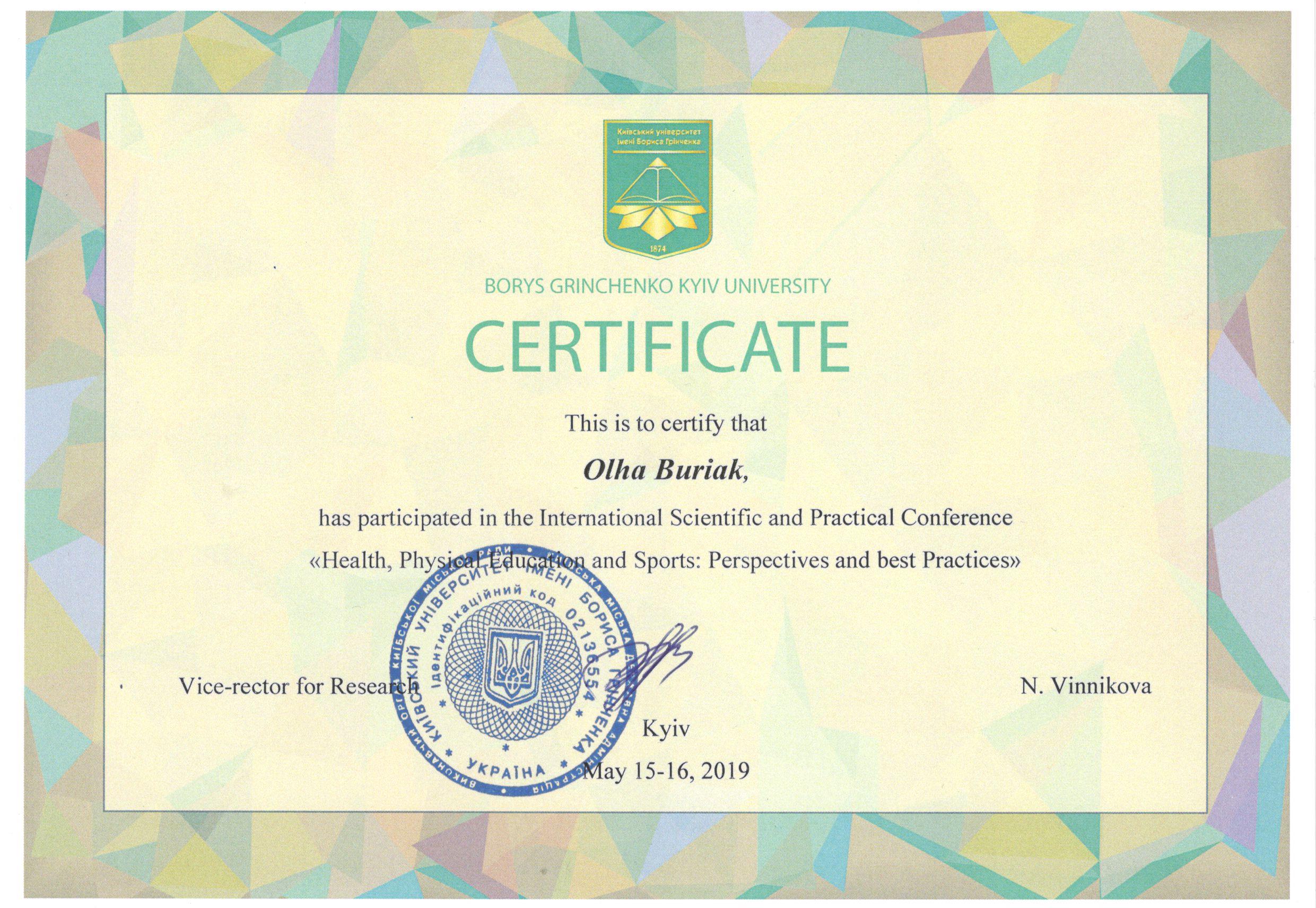 | 5026 | VII Всеукраїнська науково-практична конференція "Фізичне виховання, спорт та здоров`я людини; досвід, проблеми, перспективи" (у циклі Анохінських читань) | учасник конференції | Київський університет імені Бориса Грінченка |