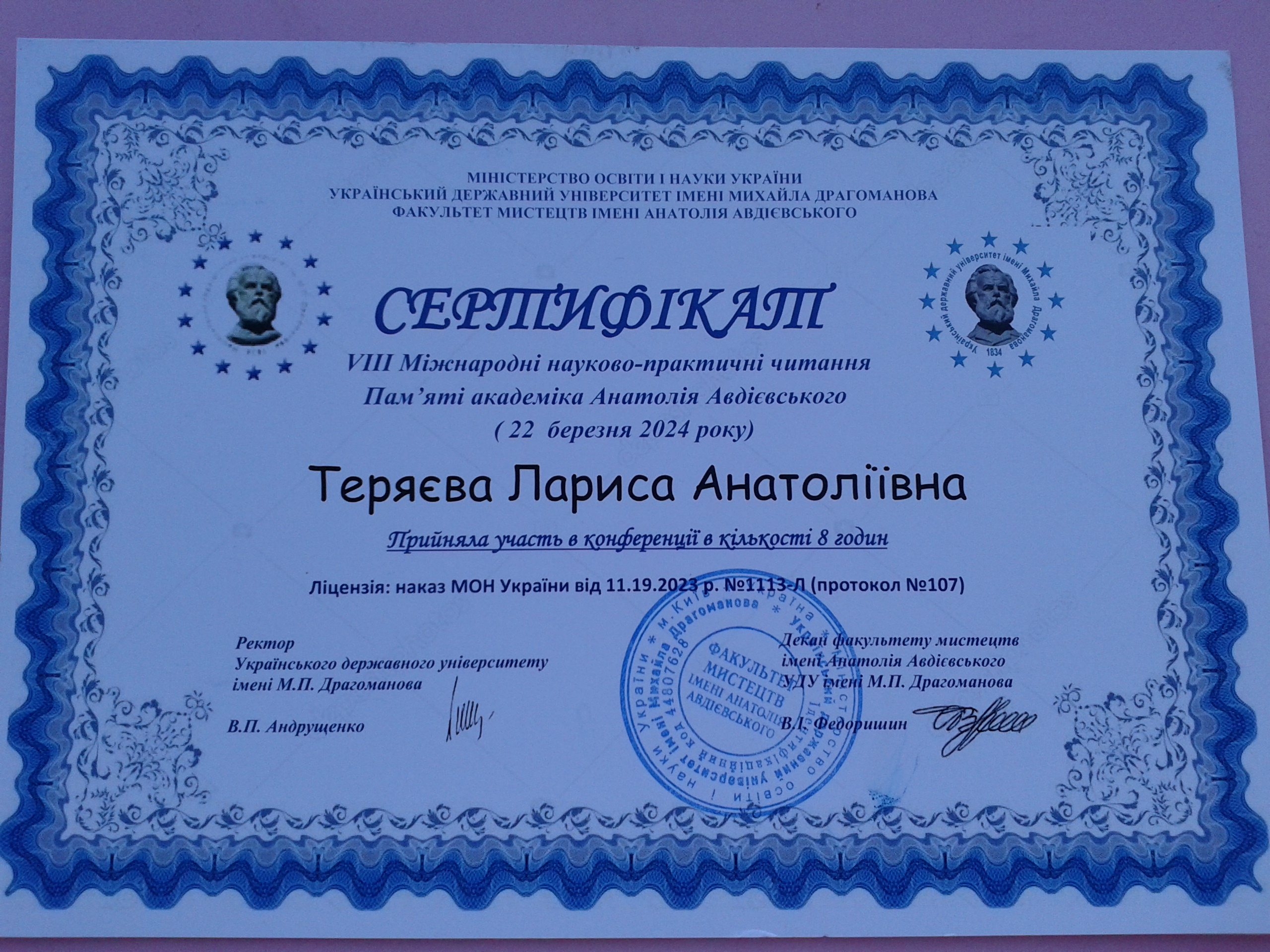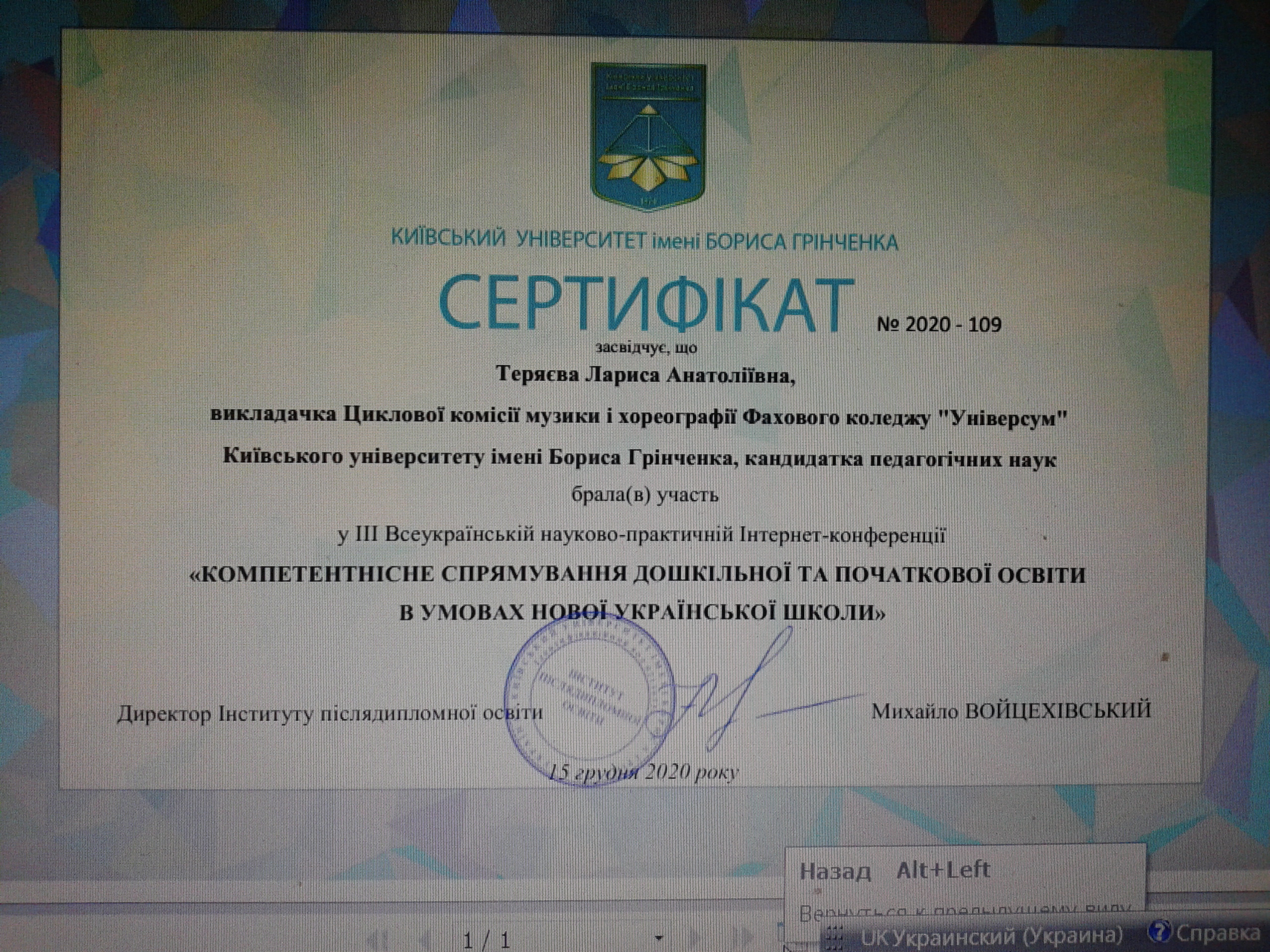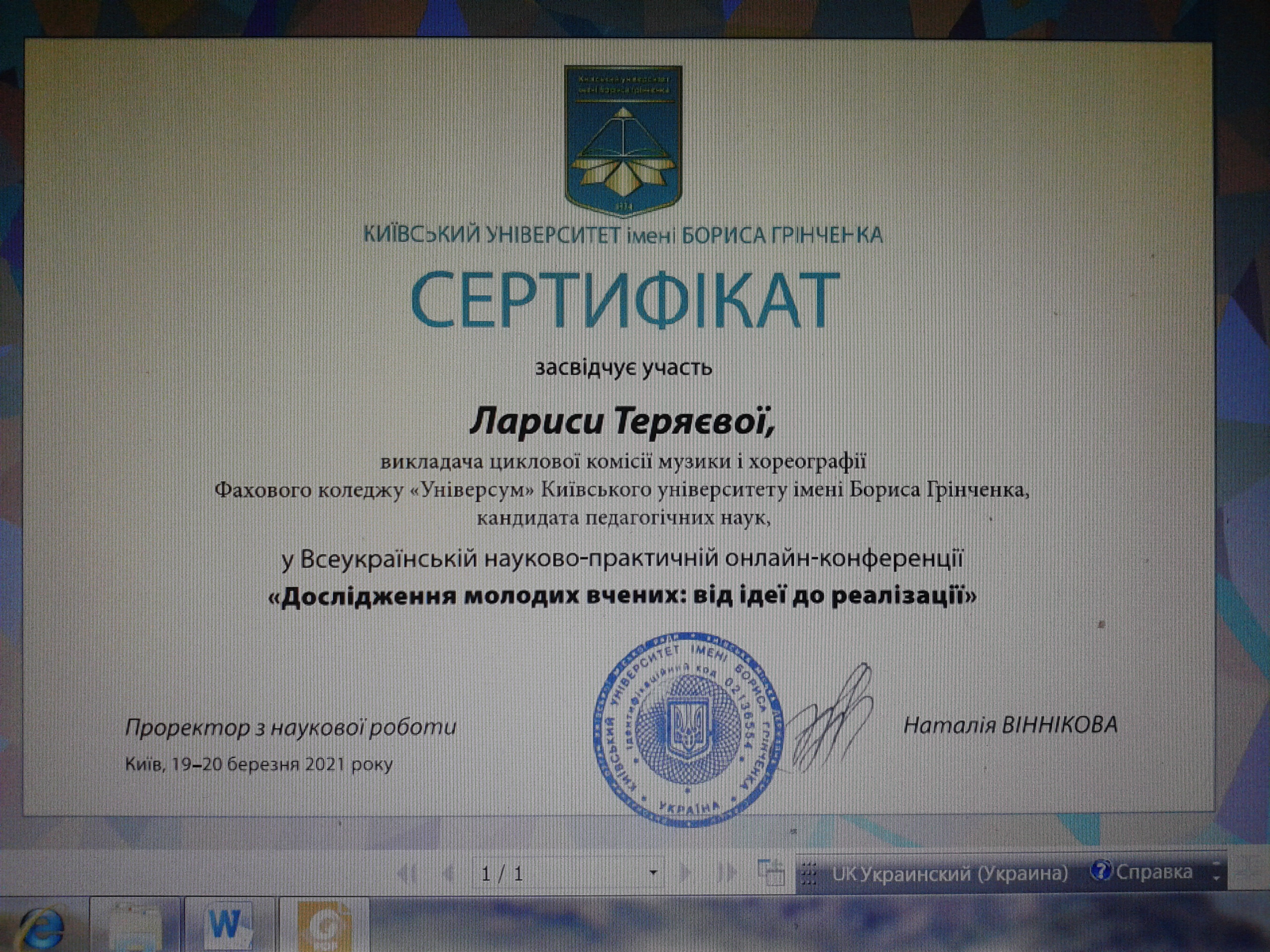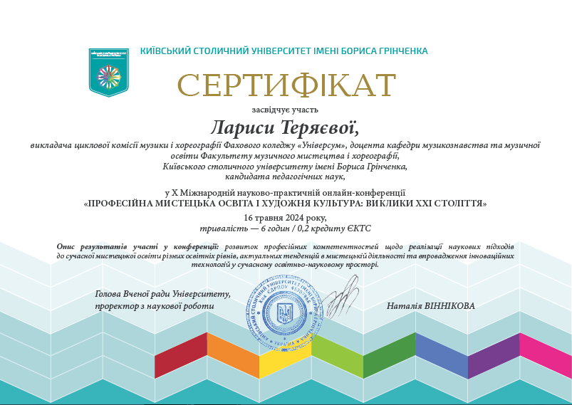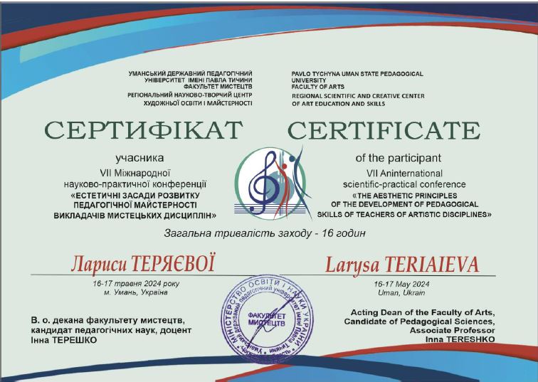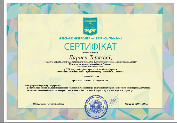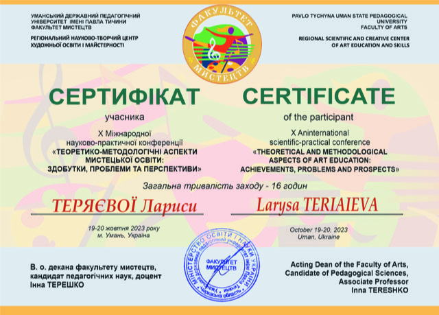 | 392 | Фаховий коледж «Універсум» | ЦК музики і хореографії | 11.2 | 2 | 2025 | https://www.researchgate.net/profile/Larisa_Teraeva |