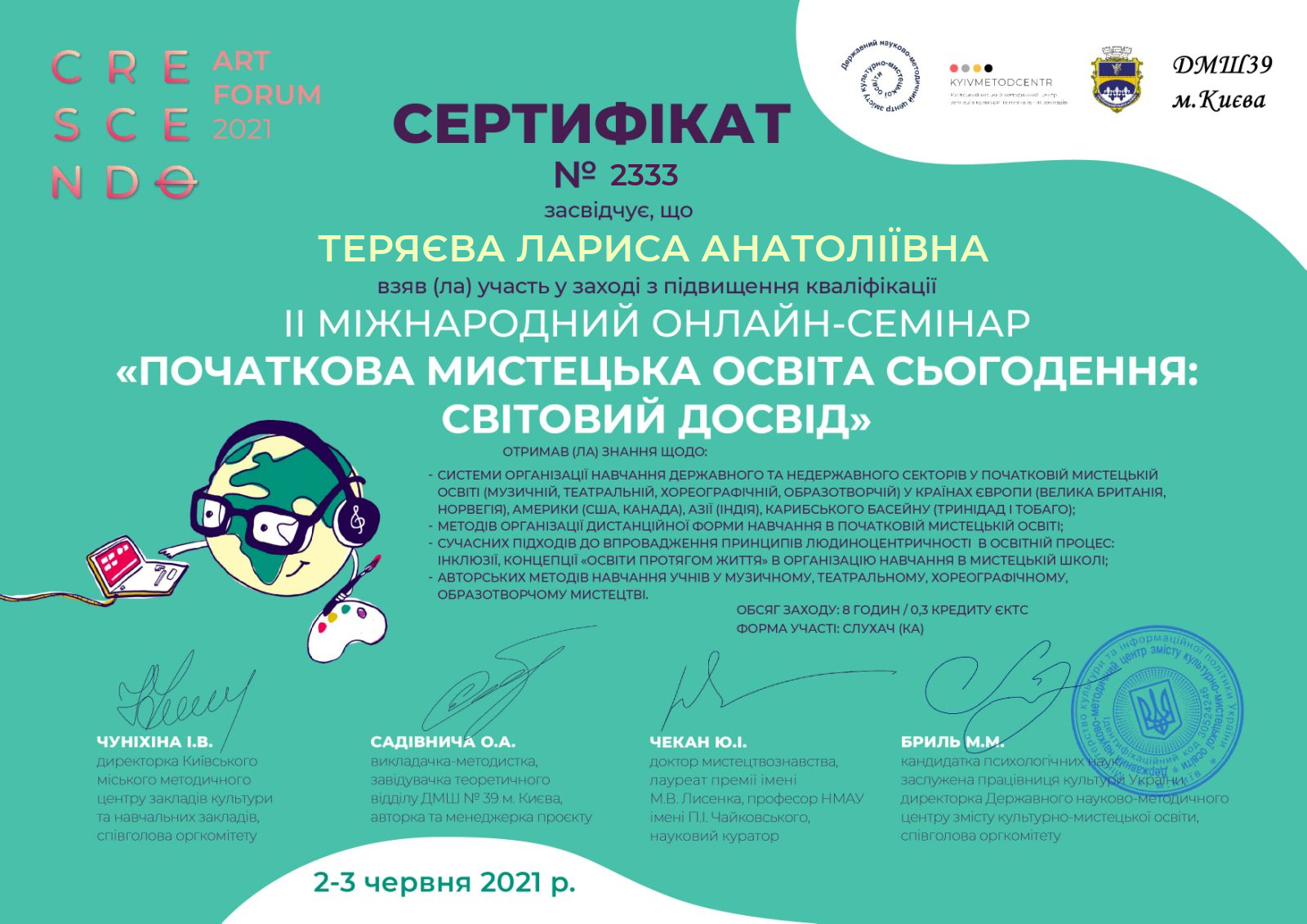 | 7577 | Міжнародний онлайн-семінар «Початкова мистецька освіта сьогодення: світовий досвід» | слухач | м.Київ |