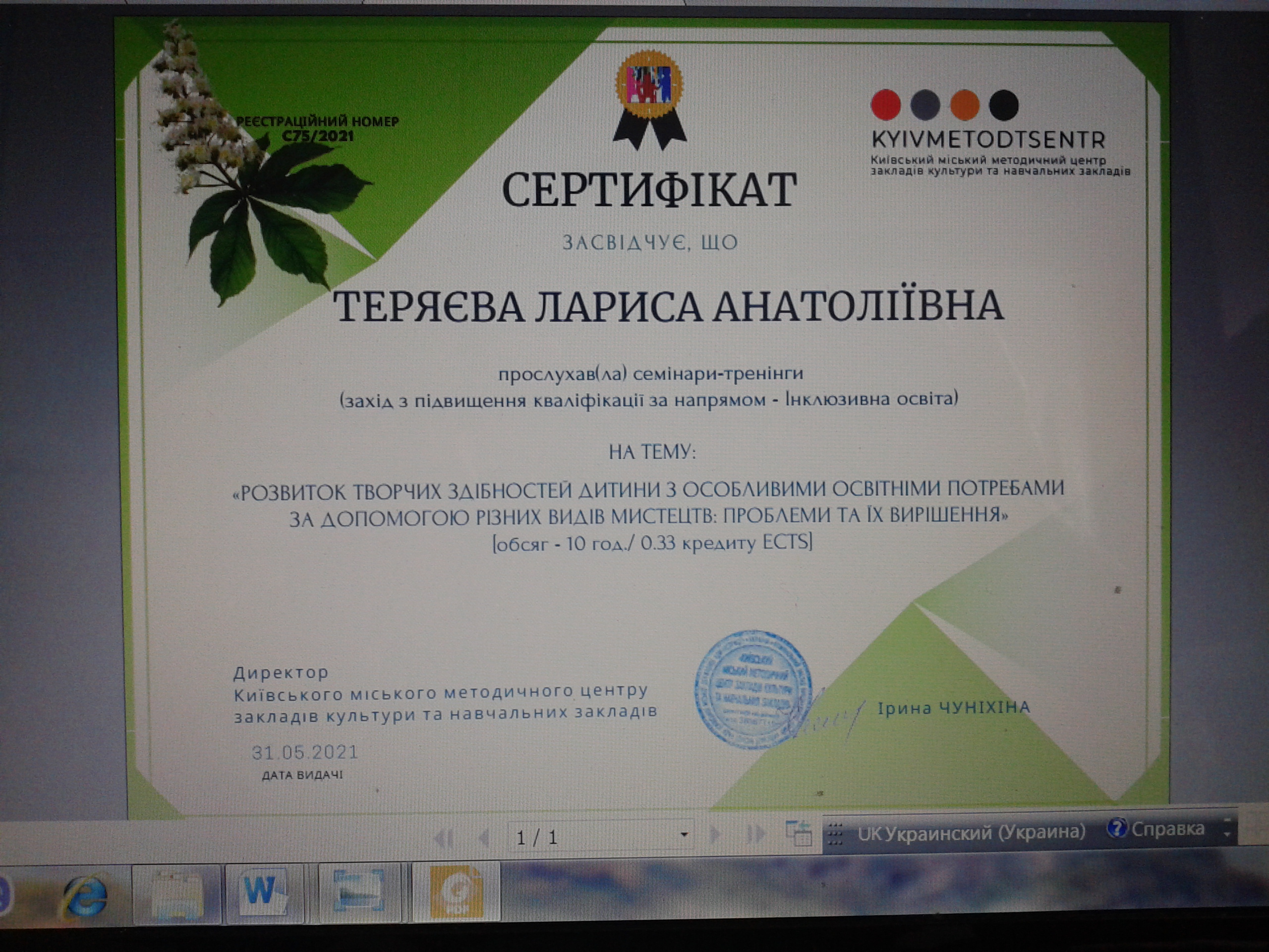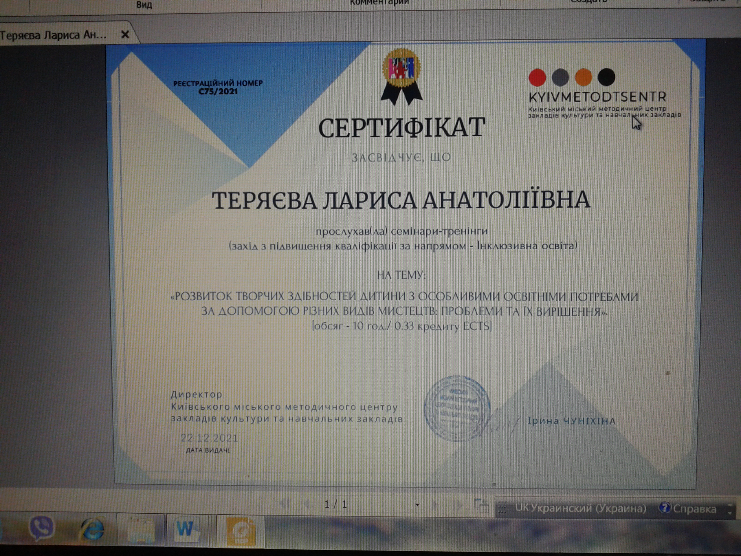 | 7809 | семінари- тренінги Розвиток творчих здібностей дитини з особливими освітніми потребами за допомогою різних видів мистецтв: проблеми та їх вирішення | слухач семінарів-тренінгів | м. Київ |
