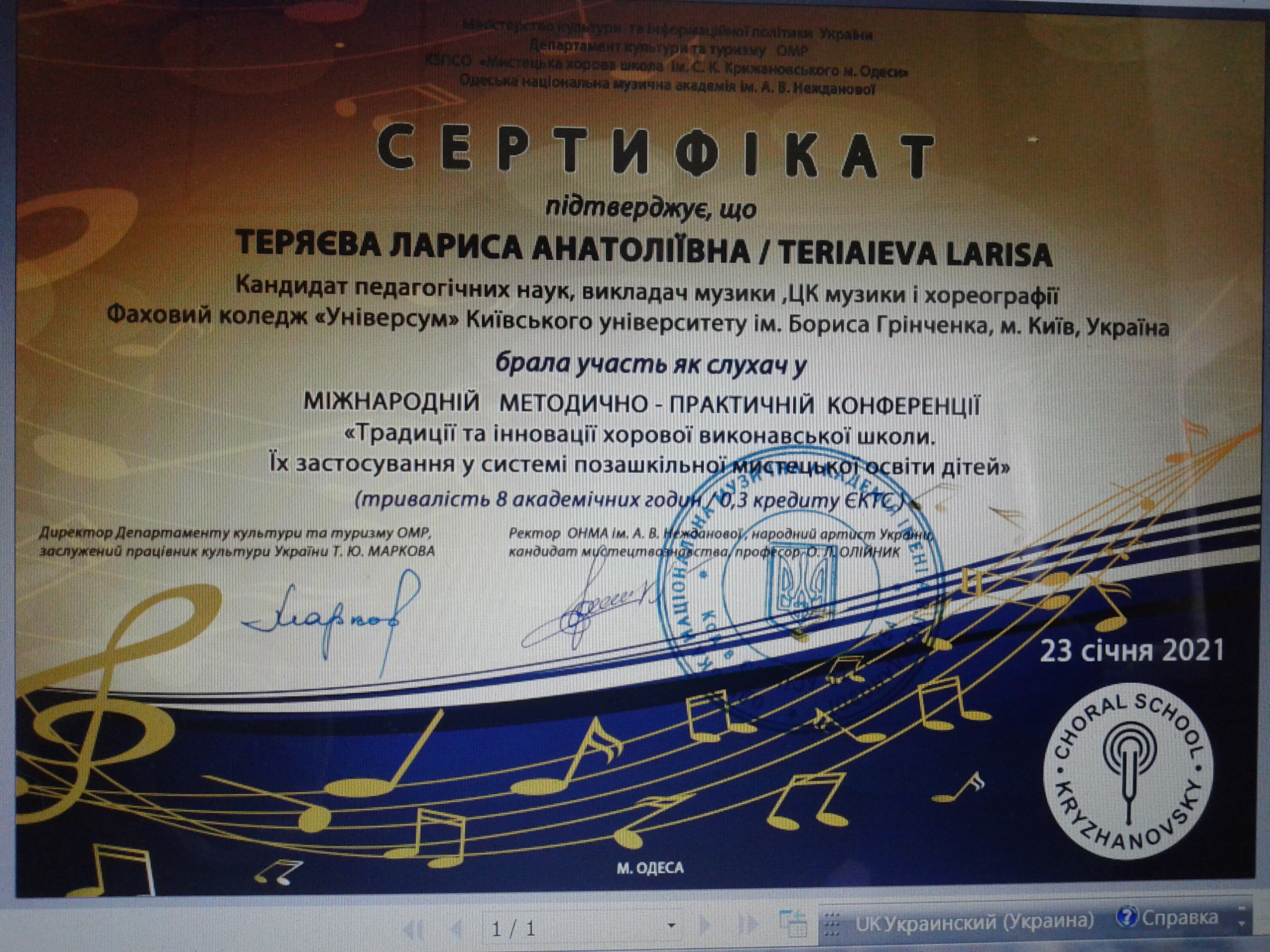 | 7810 | Міжнародна методично-практична конференція Традиції та інновації хорової виконавської школи.Їх застосування у системі позашкільної мистецької освіти дітей Традиції та інновації хорової виконавської школи. Їх застосування у системі позашкільної мистецької освіти дітей | слухач | м.Одеса |