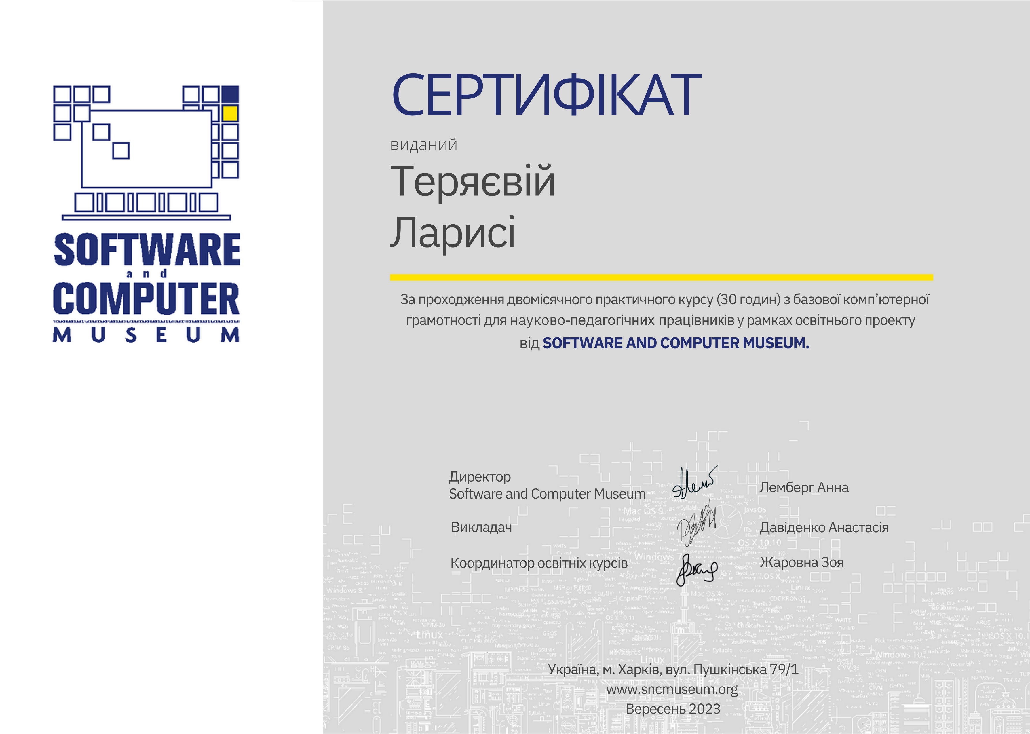 | 9755 | Підвищення кваліфікації від SOFTWARE AND COMPUTER MUSEUM. | двомісячний практичний курс (30 год) з базової компютерної грамотності | м.Харків |