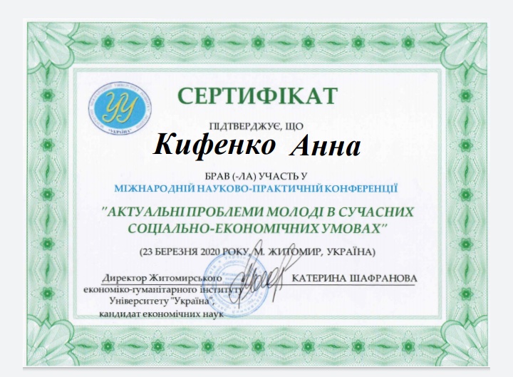 66 VII Всеукраїнська студентська наукова конференція «Експериментальні та теоретичні дослідження в контексті сучасної науки» Циганчук Юлія Геннадіївна, Трофимова Анна Андріївна 2024 Всеукраїнський рівень Покликання