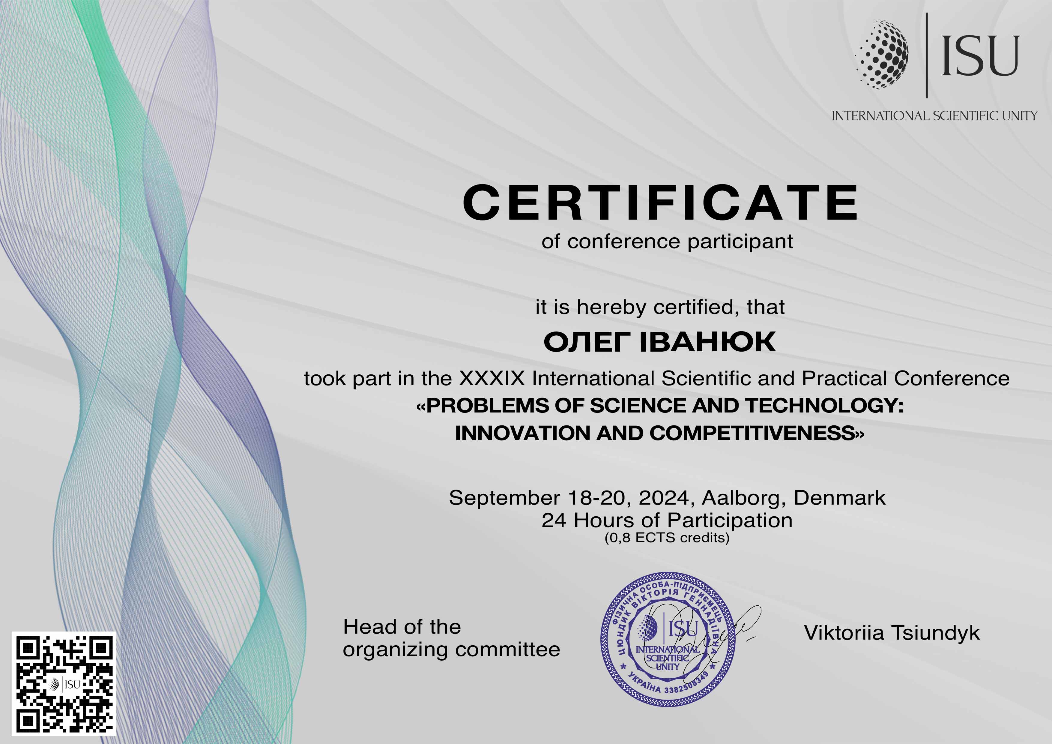| 10694 | XXXIX International scientific and practical conference «Problems of Science and Technology: Innovation and Competitiveness | Описи міст Харківської губернії у тревелогах останньої чверті 18-першої половини 19 ст. | Aalborg, Denmark. |