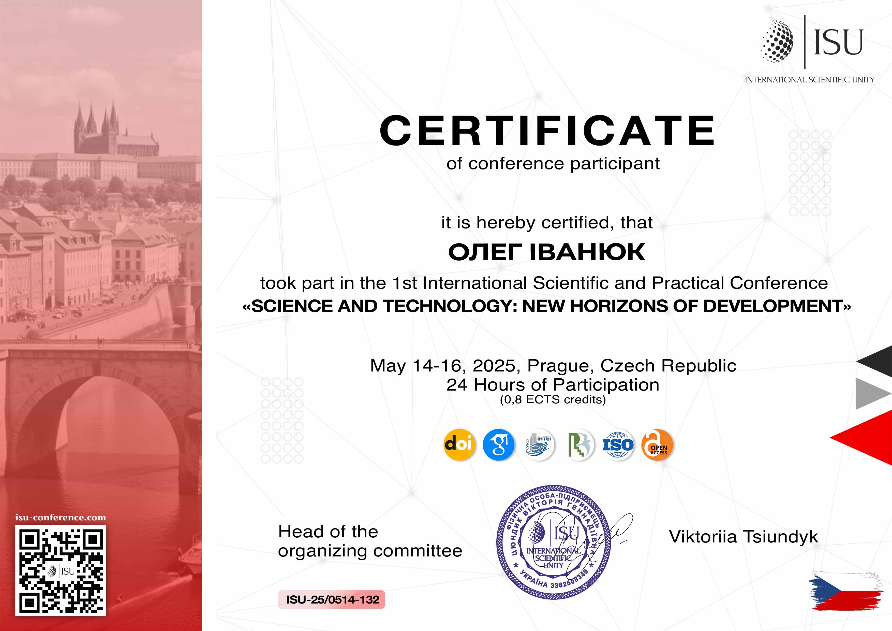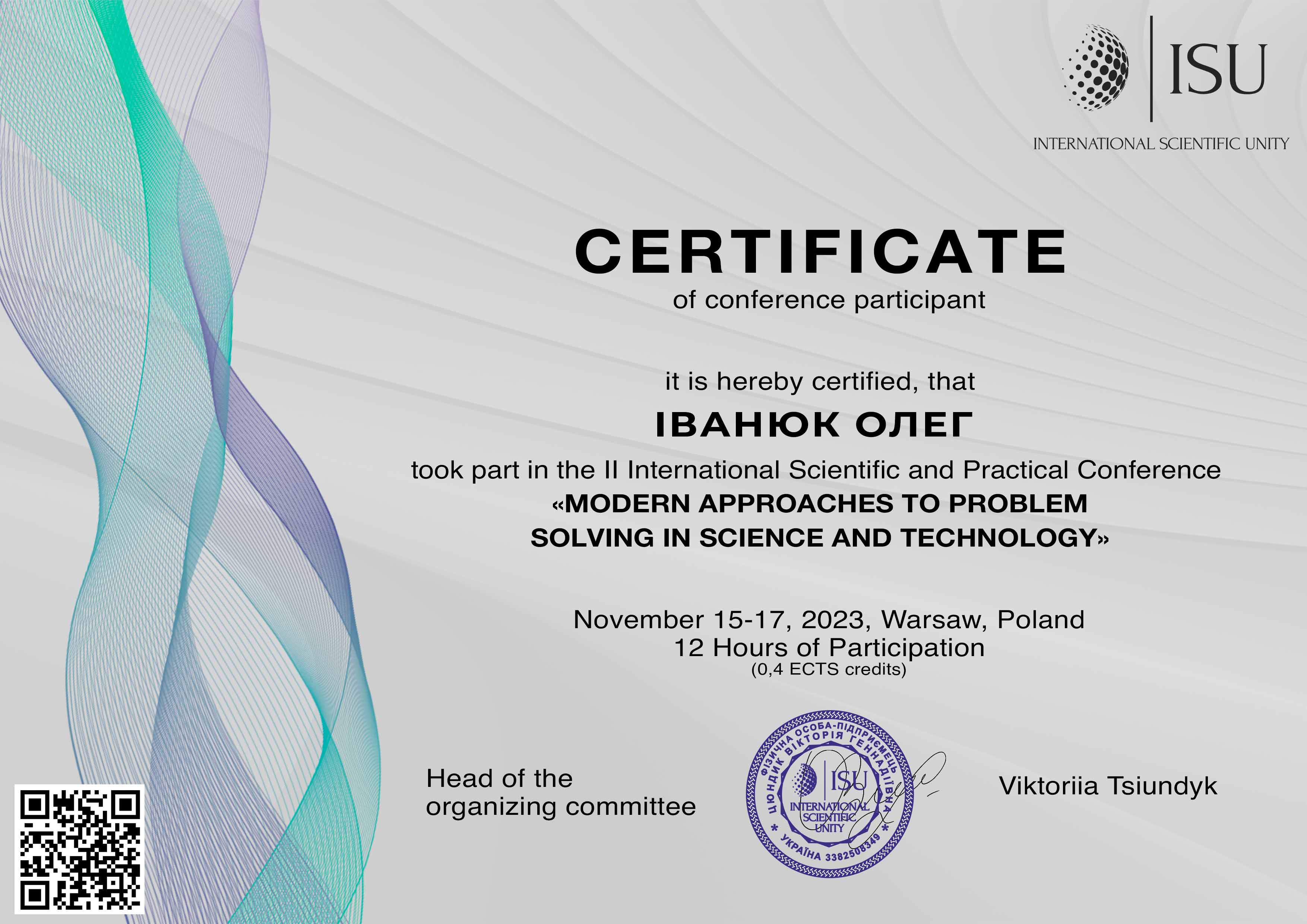 | ID | Назва | Тема доповіді | Місце проведення | Документ, що засвідчує | Дата проведення |