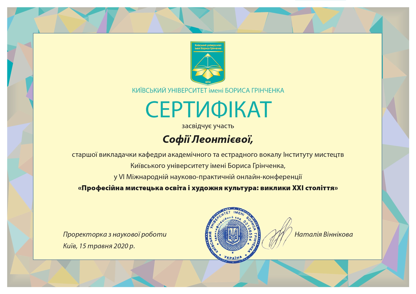 | 433 | Перший Всеукраїнський конкурс вокалістів «Світова класика українською» (Диплом лауреата І премії Дар’я Царинюк, Диплом лауреата ІІІ премії Вікторія Бабійчук.)link | особиста участь | м. Київ, Будинок-музей ім. М. Лисенка | Покликання | 11.11.2017 00:00 |