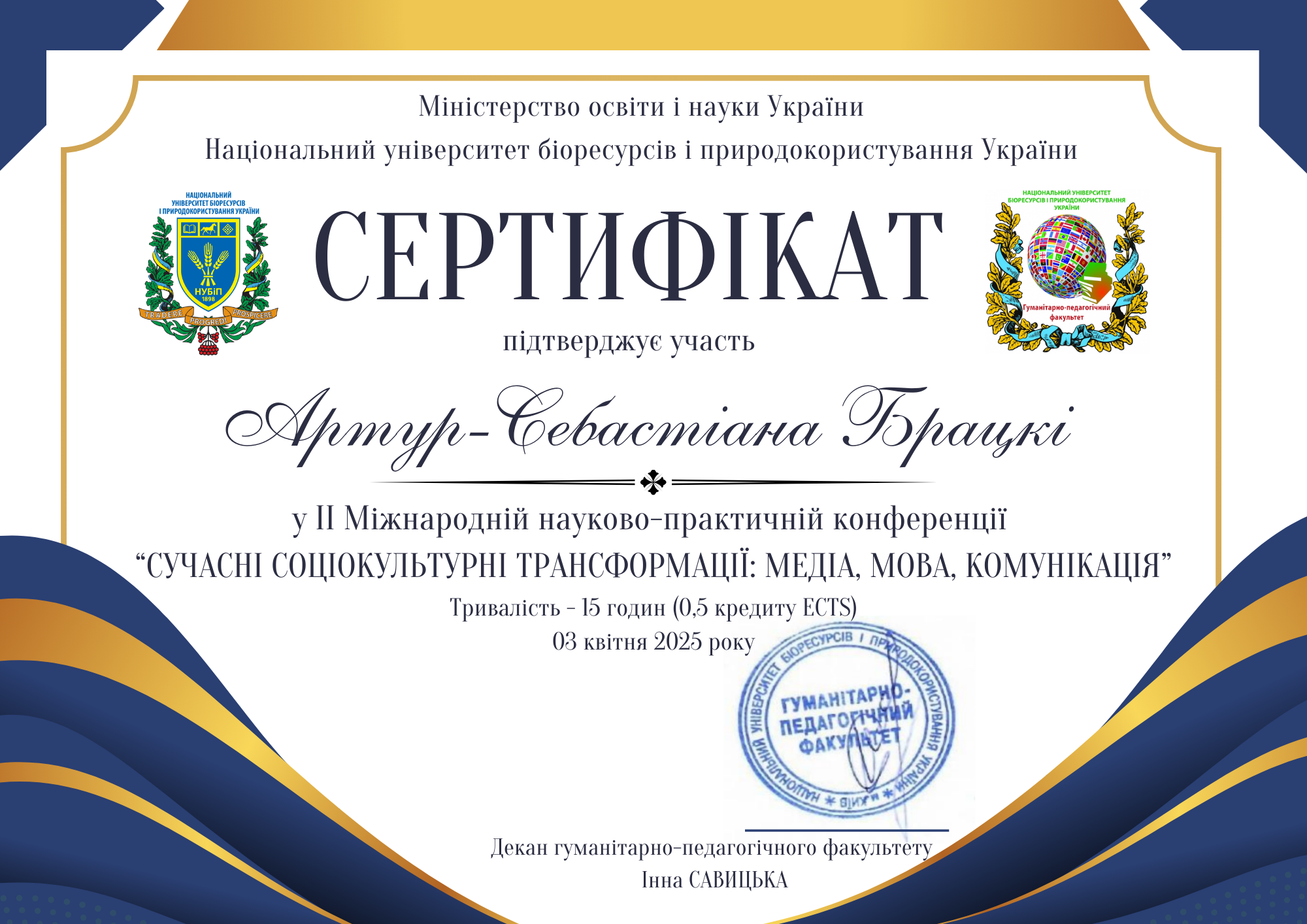| ID | Назва | Тема доповіді | Місце проведення | Документ, що засвідчує | Дата проведення |