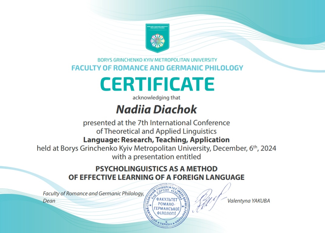 | 11479 | Language: Research, Teaching, Application | Psycholinguistics sa a method of effective learning of a foreing language | Київ |