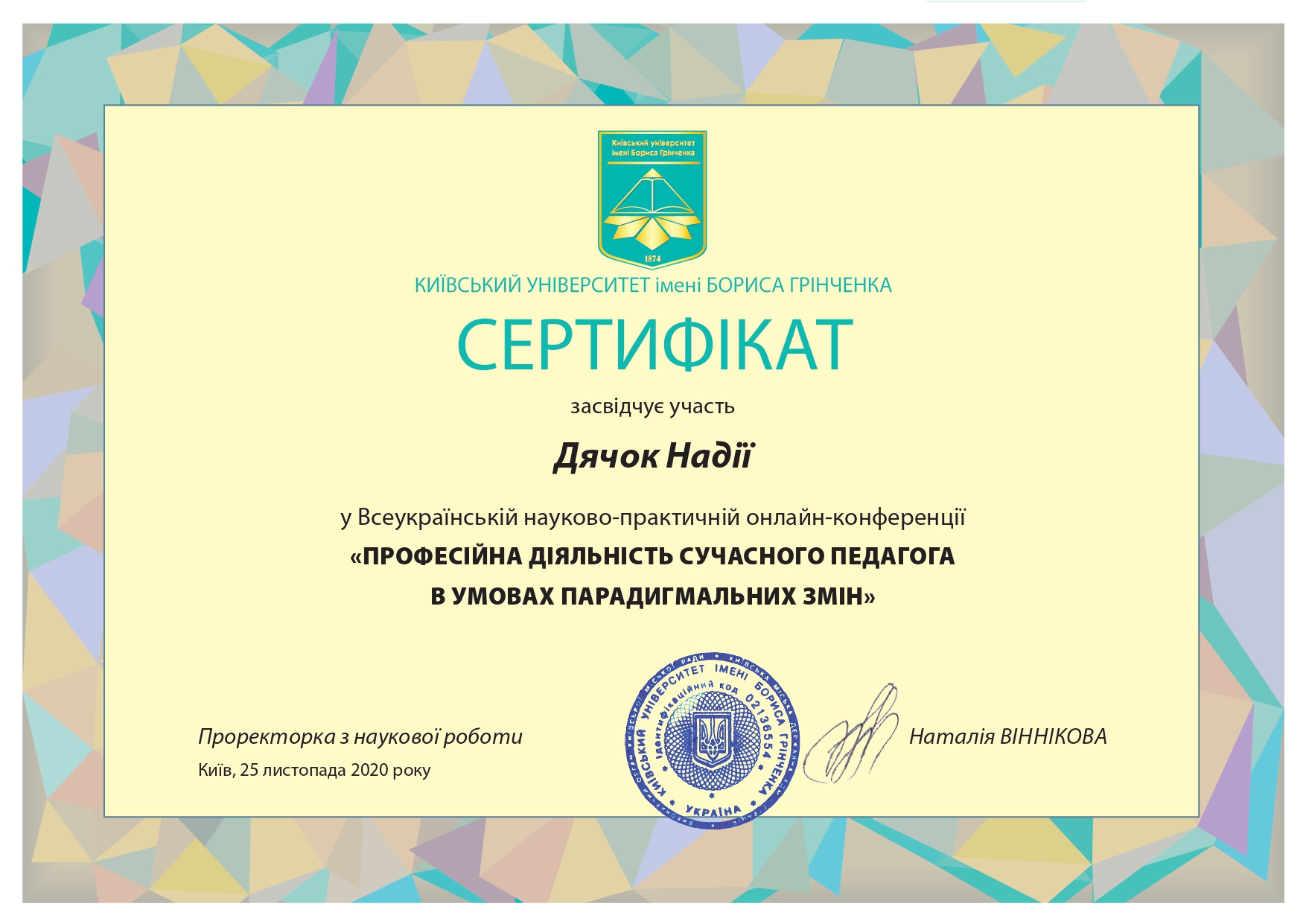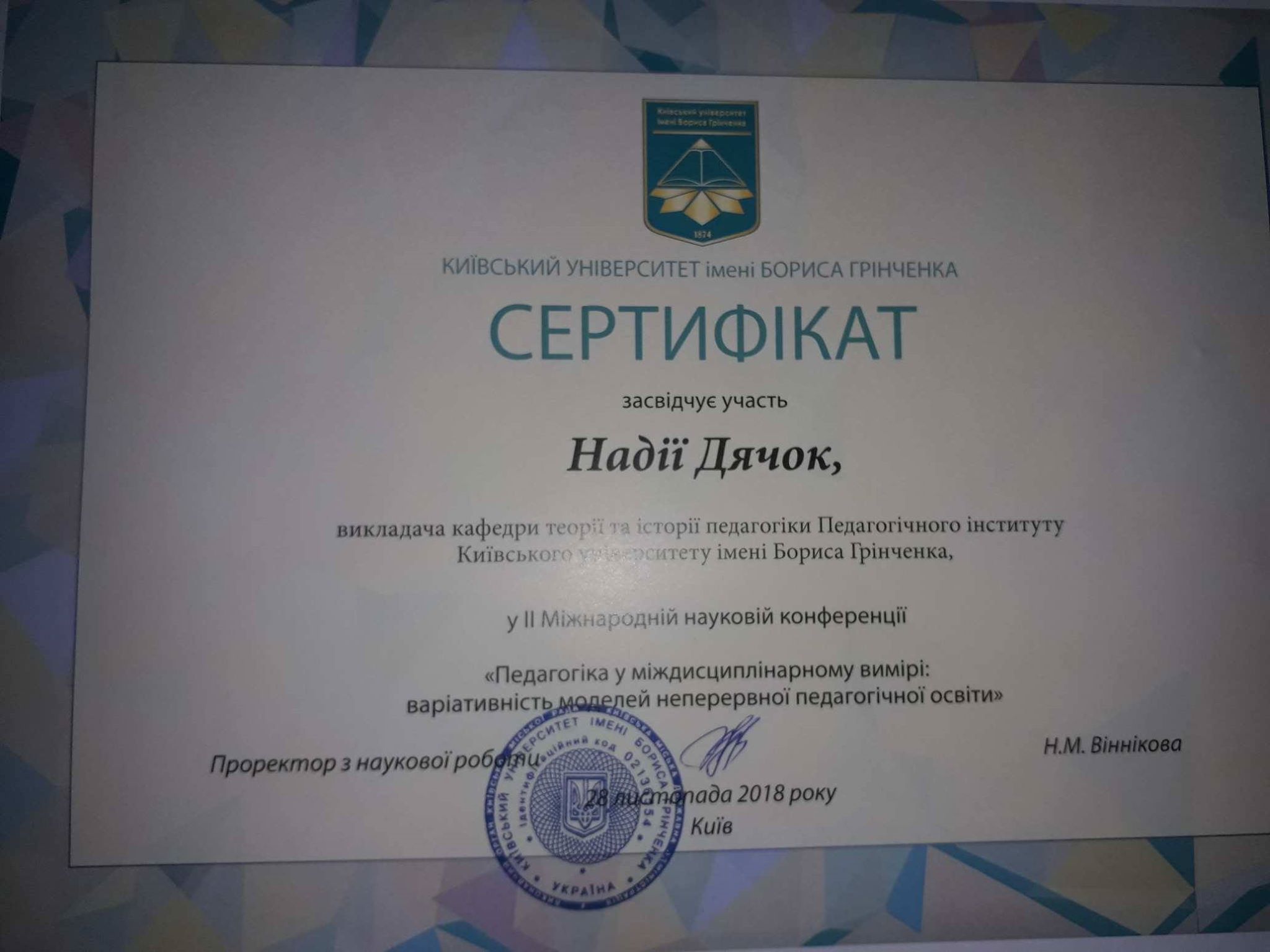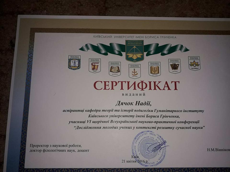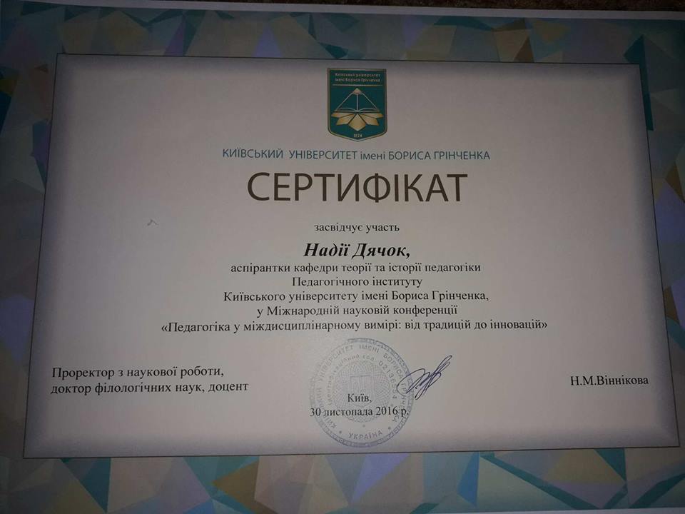 2015 - 2018 н.р. Аспірантка кафедри теорії та історії педагогіки Київського університету імені Бориса Грінченка;