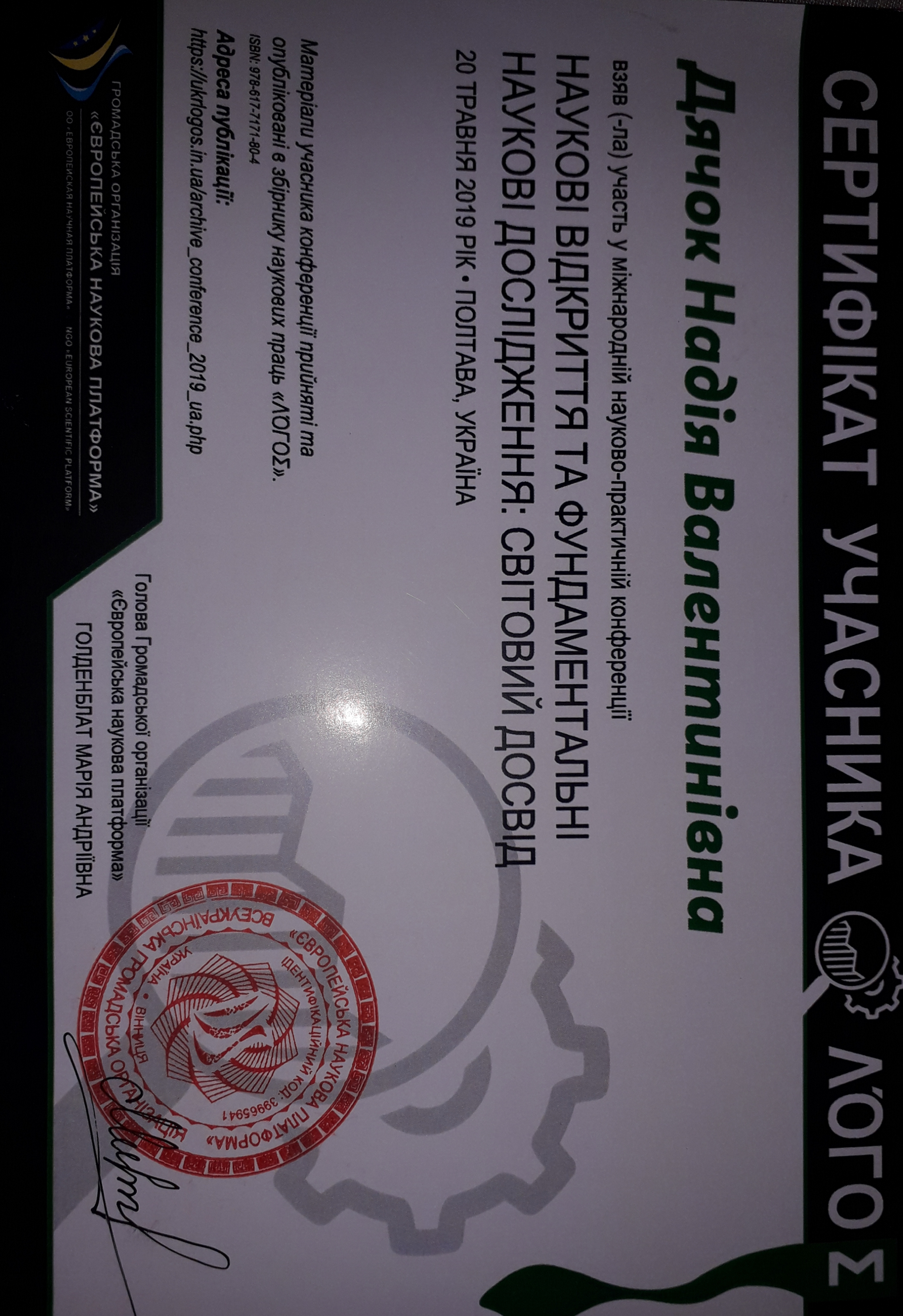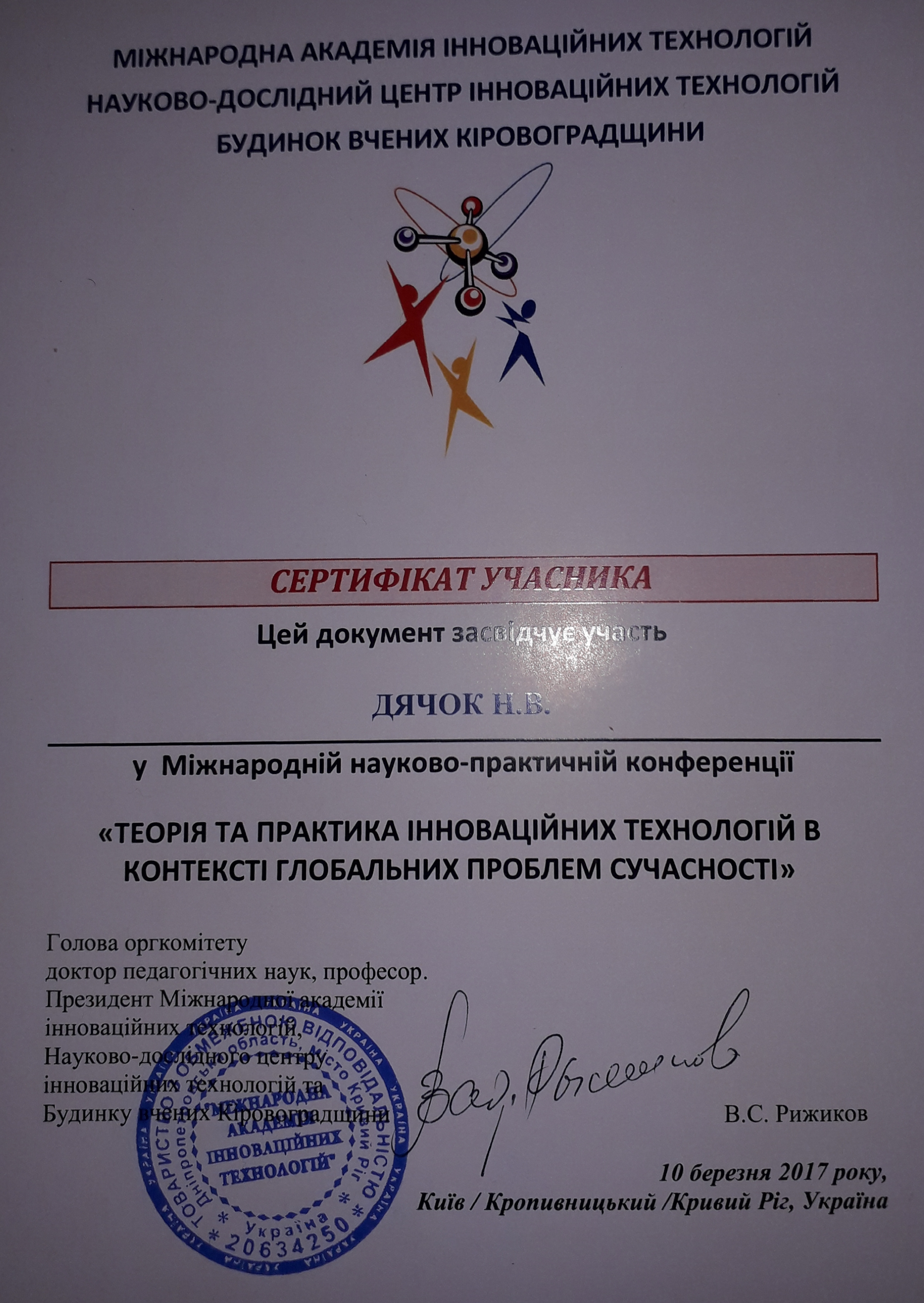 | ID | Назва | Тема доповіді | Місце проведення | Документ, що засвідчує | Дата проведення |