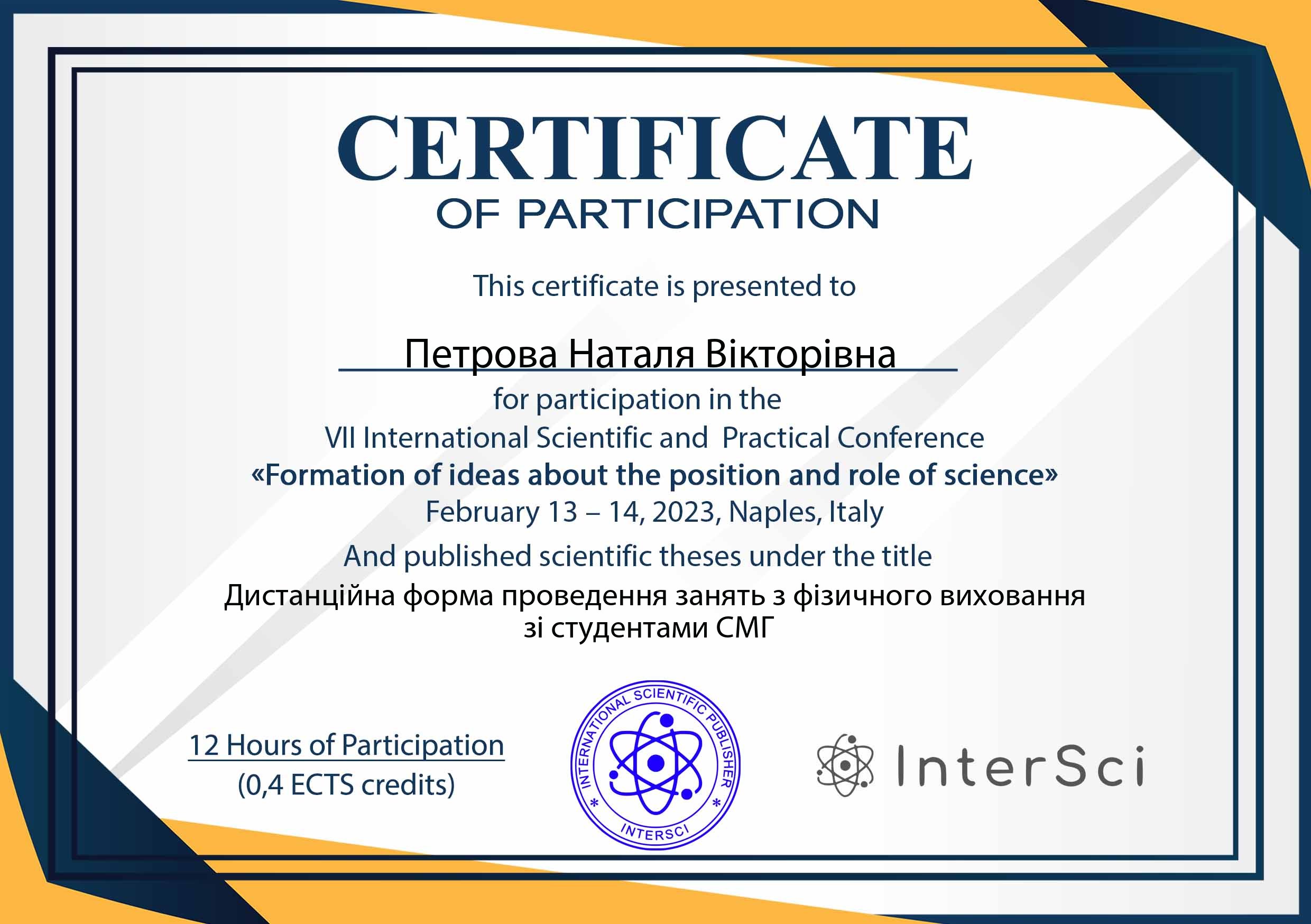 | 8880 | Формування уявлень про місце і роль науки | Дистанційна форма проведення занять з фіз вих зі студентами СМГ | Італія, Неаполь |
