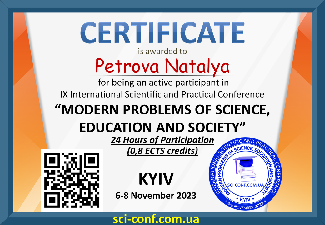 | ID | Назва | Тема доповіді | Місце проведення | Документ, що засвідчує | Дата проведення |