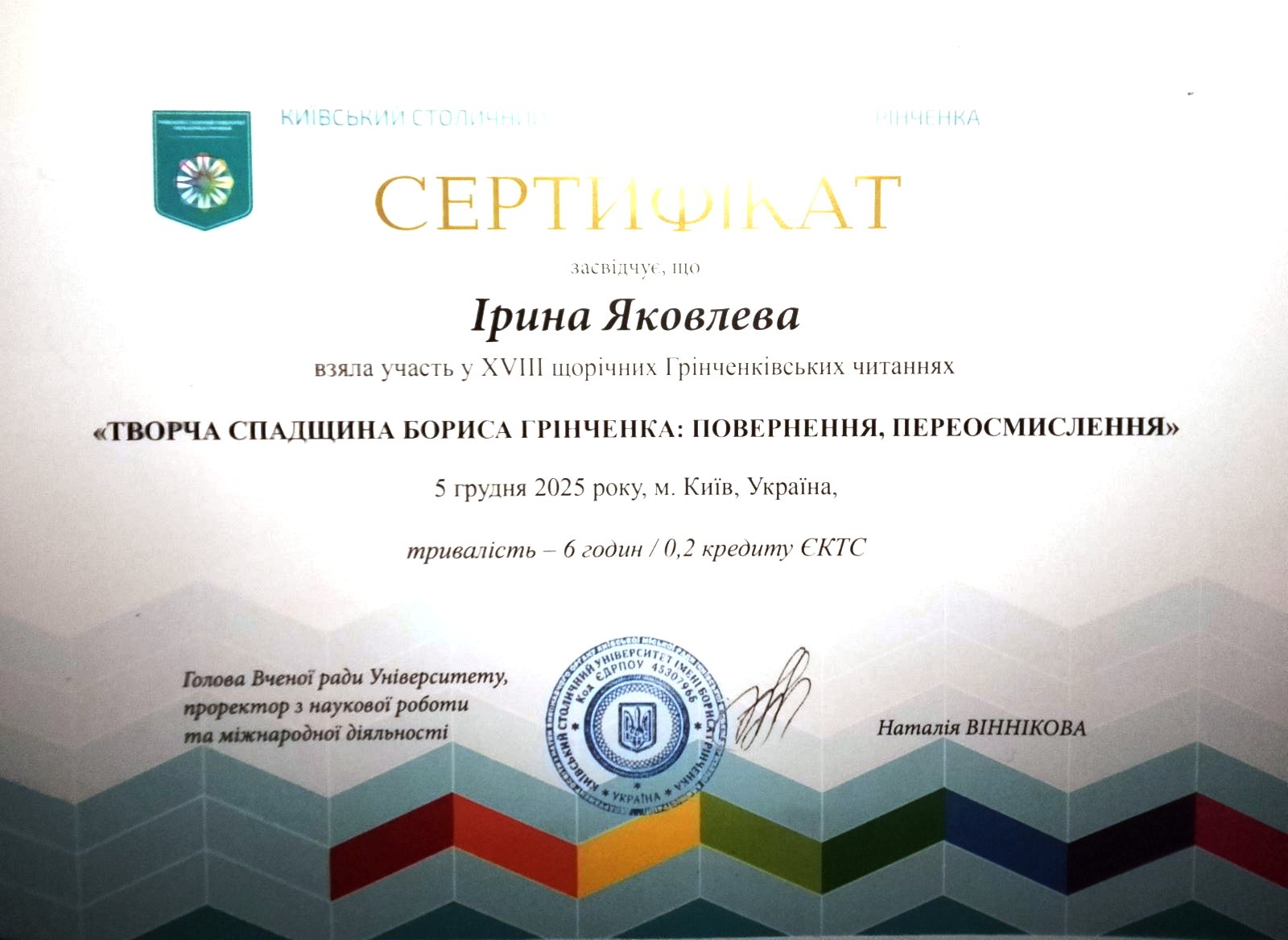 | 690 | Єремеєва Юлія Віталіївна | Факультет української філології, культури і мистецтва | II | Конкурс відео-робіт "Лідер українства: всесвітнє значення Бориса Грінченка" | Київ | 2025 | Всеукраїнський | I | 5-diplom-peremozhtsia-mistse-pamiati-docx.pdf |