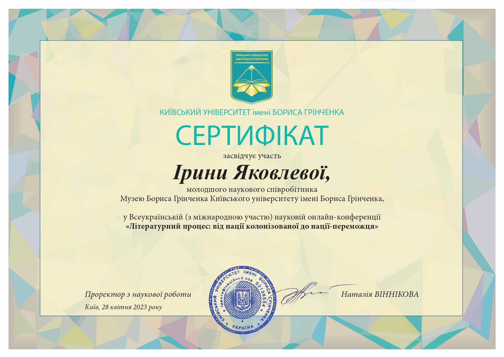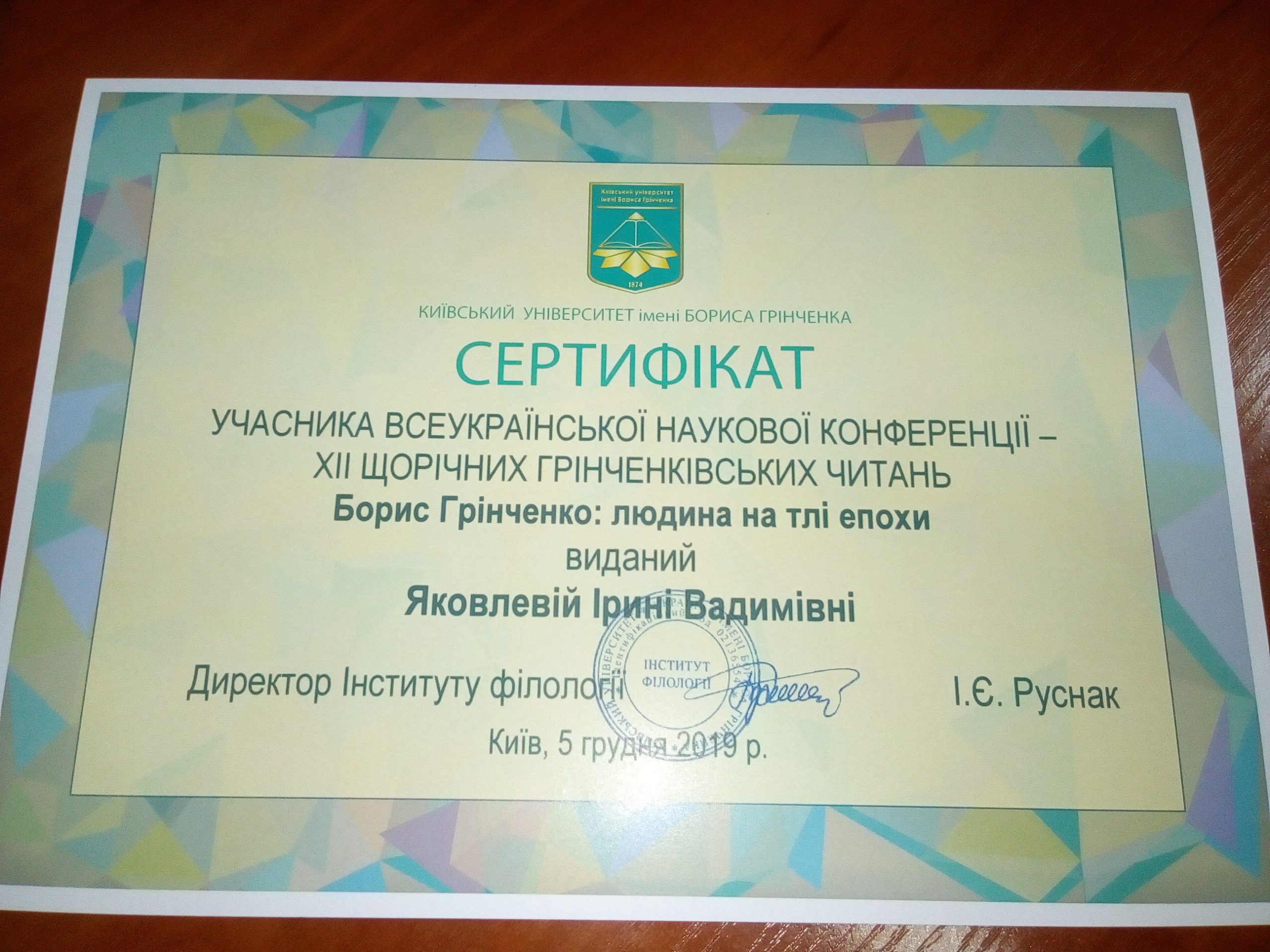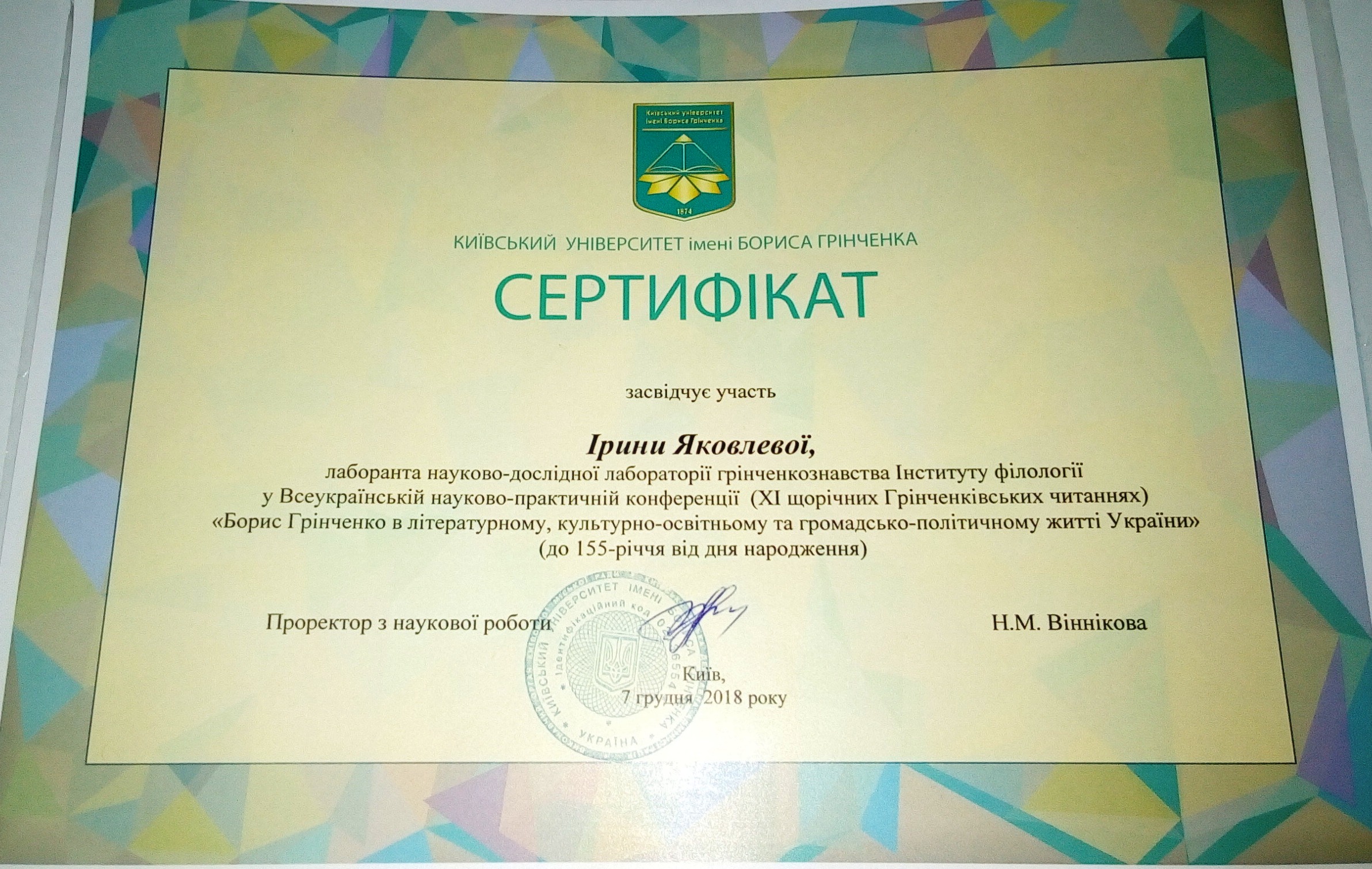 | 12868 | Всеукраїнський круглий стіл «Творча спадщина Бориса Грінченка: повернення, переосмислення» | Грінченкознавець: пам’яті Василя Яременка | Київ |