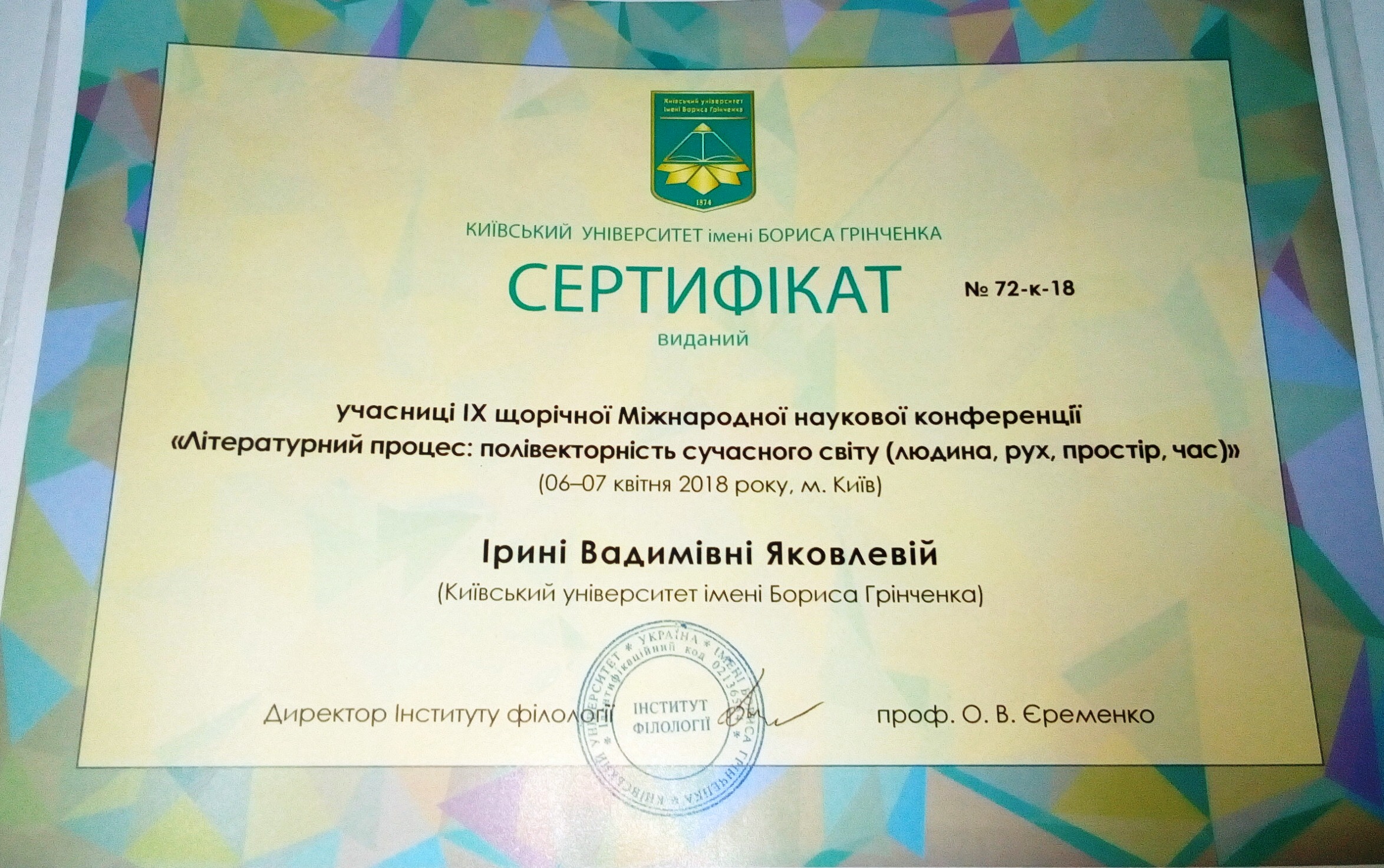 | 430 | Інститут філології | Кафедра української літератури, компаративістики і грінченкознавства | 9.3 | 0 | 2021 | https://www.researchgate.net/profile/Iryna_Yakovleva |