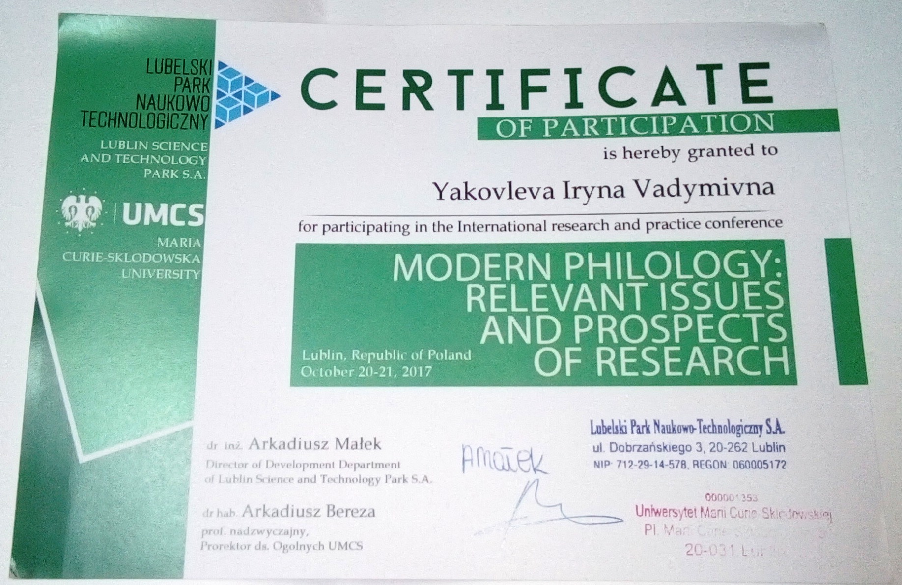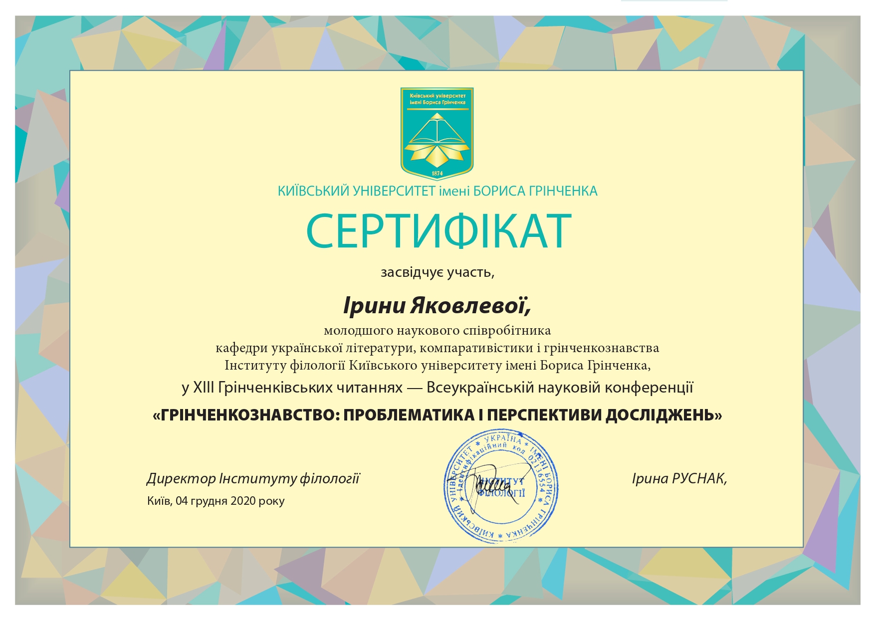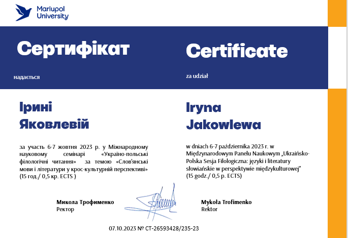 | 4907 | Міжнародна науково-практична конференція «Сучасна філологія: актуальні питання та перспективи дослідження» | Гендерний дискурс у творах Бориса та Марії Грінченків як феномен соціокультурної ситуації кінця ХІХ – початку ХХ ст. | Люблін, Польща |