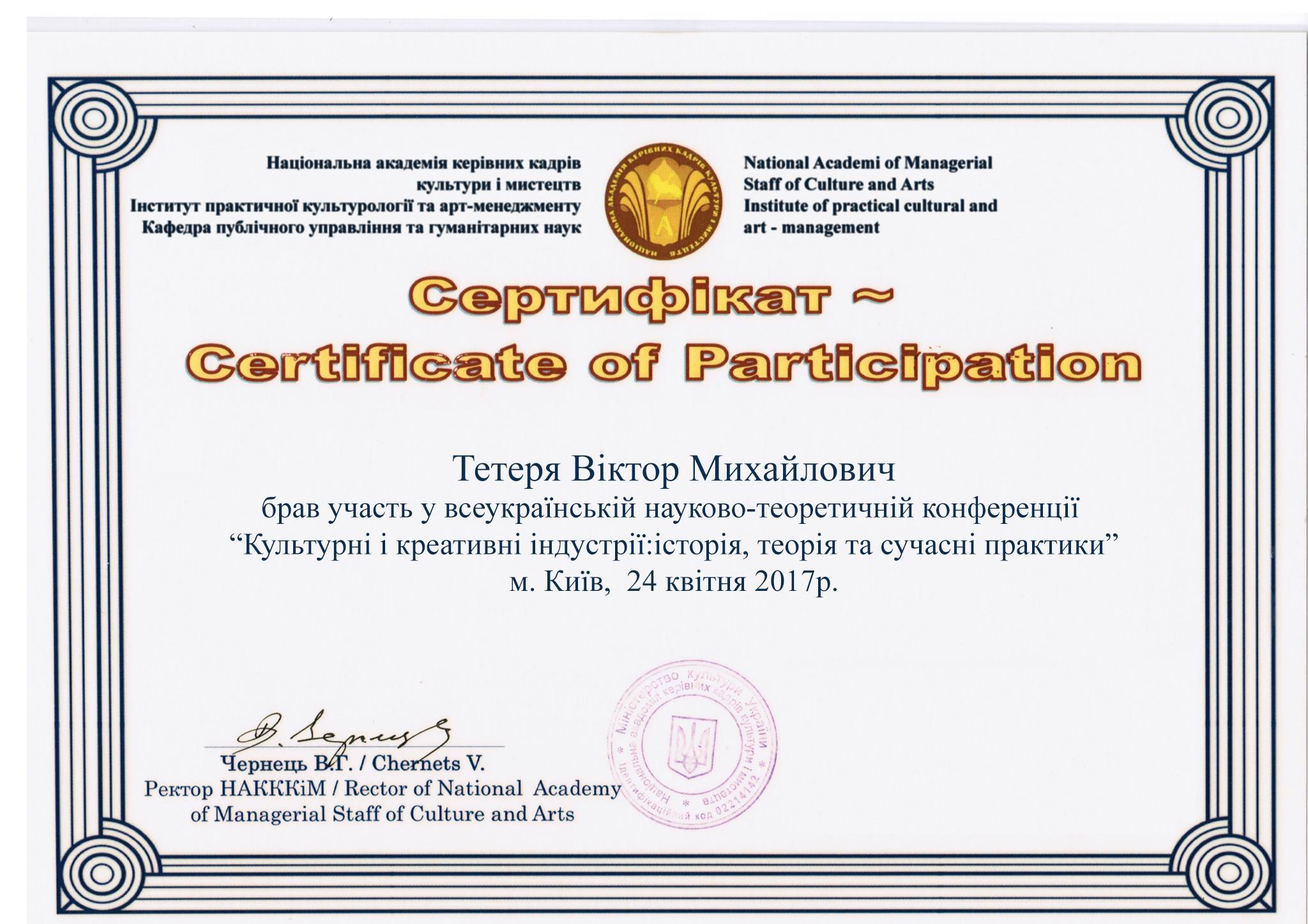| 468 | Підготовка до ІХ Інтернаціонального Українського Музичного Конкурсу пам’яті М. І. Спозіто (1 місце),9.04.2017 | особиста участь | м. Київ | - | 04.12.2017 00:00 |