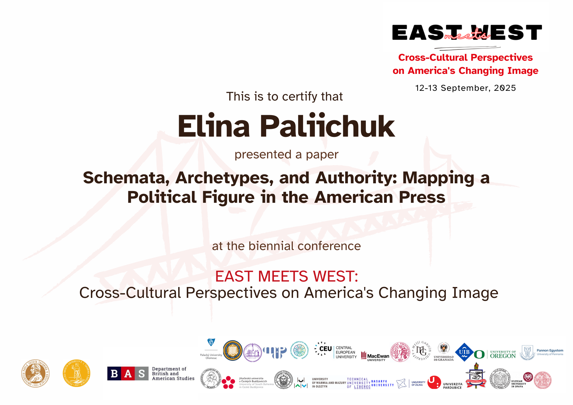 | 12376 | East Meets West: Cross-Cultural Perspectives on America’s Changing Image | Schemata, Archetypes, and Authority: Mapping a Political Figure in the American Press | Pavol Jozef Šafárik University, Košice, Slovakia |