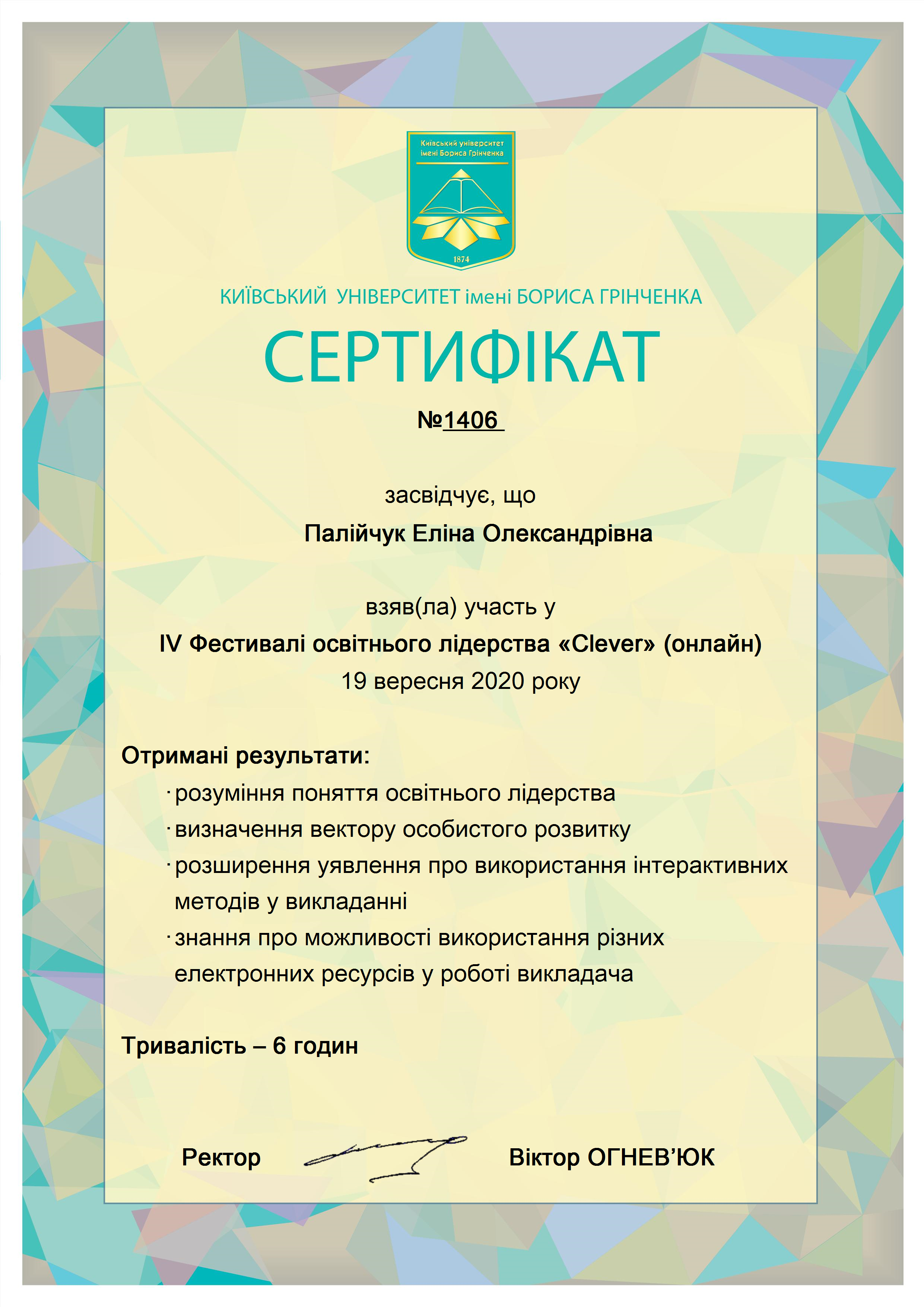 | 6194 | IV Фестиваль освітнього лідерства "Clever" | участь, підвищення кваліфікації (6 годин) | Київ, Університет імені Бориса Грінченка |