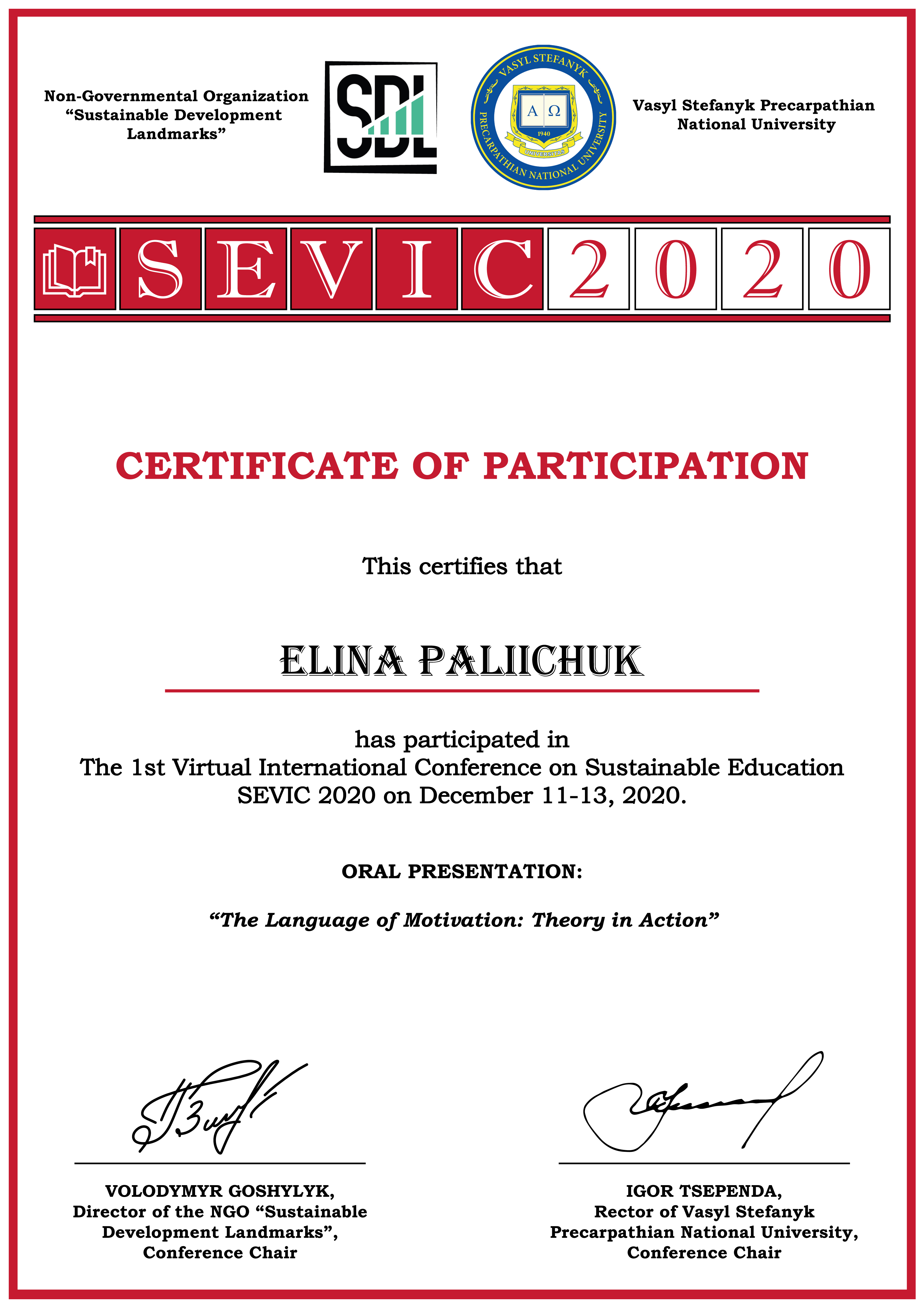 | 6214 | Перша віртуальна міжнародна конференція зі сталої освіти SEVIC 2020 | The Language of Motivation: Theory in Action | Прикарпатський національний університет імені Василя Стефаника та ГО “Орієнтири сталого розвитку” (м. Івано-Франківськ) |
