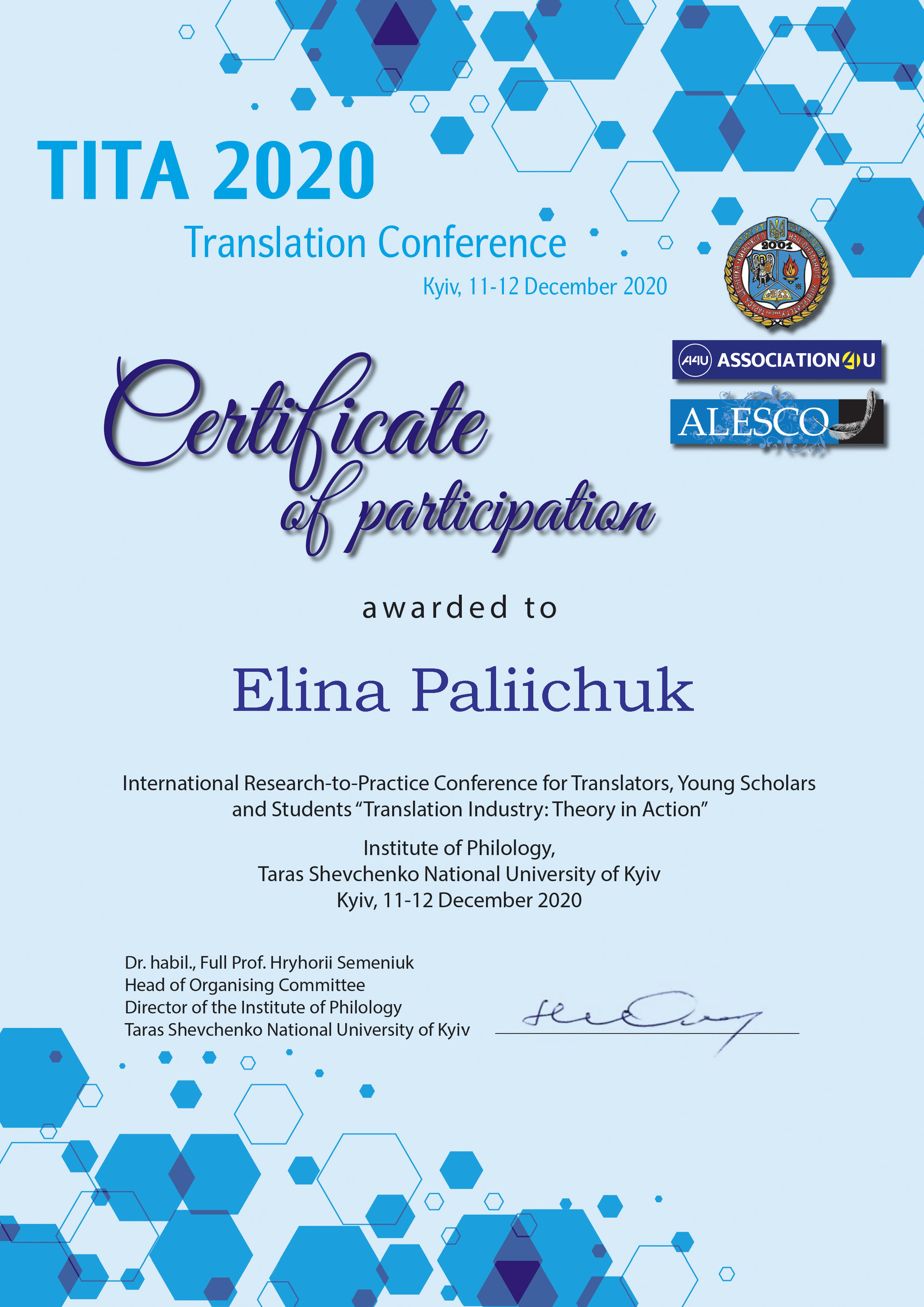 | 6215 | INTERNATIONAL RESEARCH-TO-PRACTICE CONFERENCE FOR TRANSLATORS, YOUNG SCHOLARS AND STUDENTS “TRANSLATION INDUSTRY: THEORY IN ACTION” TITA 2020 | Фриланс під мікроскопом: досвід участі у проєкті A4U | Kyiv, Taras Shevhenko Kyiv National University |