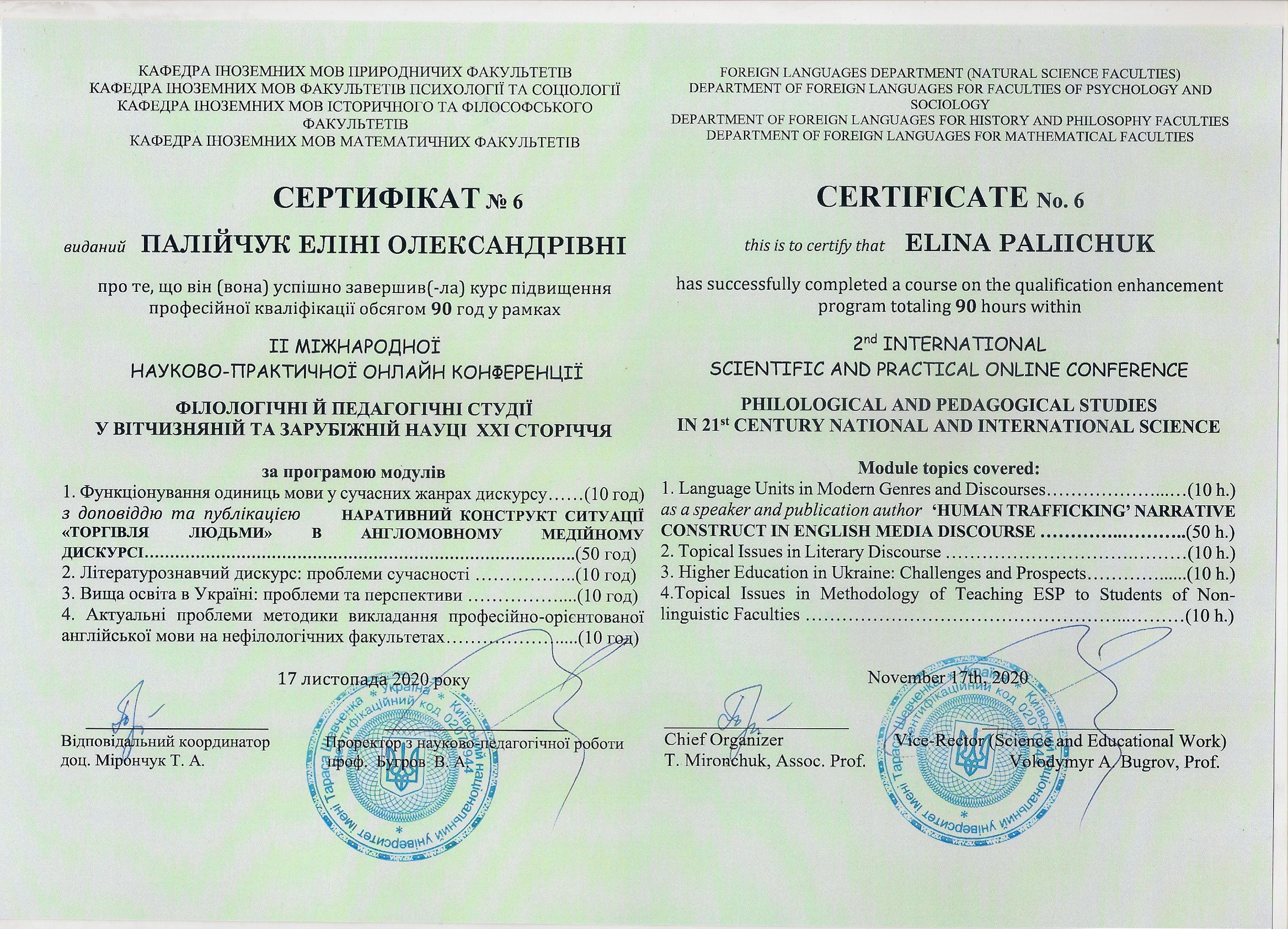 | 7111 | Фаховий модуль (стажування) | Фаховий модуль (за кордоном) | Certificate_Elina Paliichuk.pdf | 18.11.2022 00:00 |