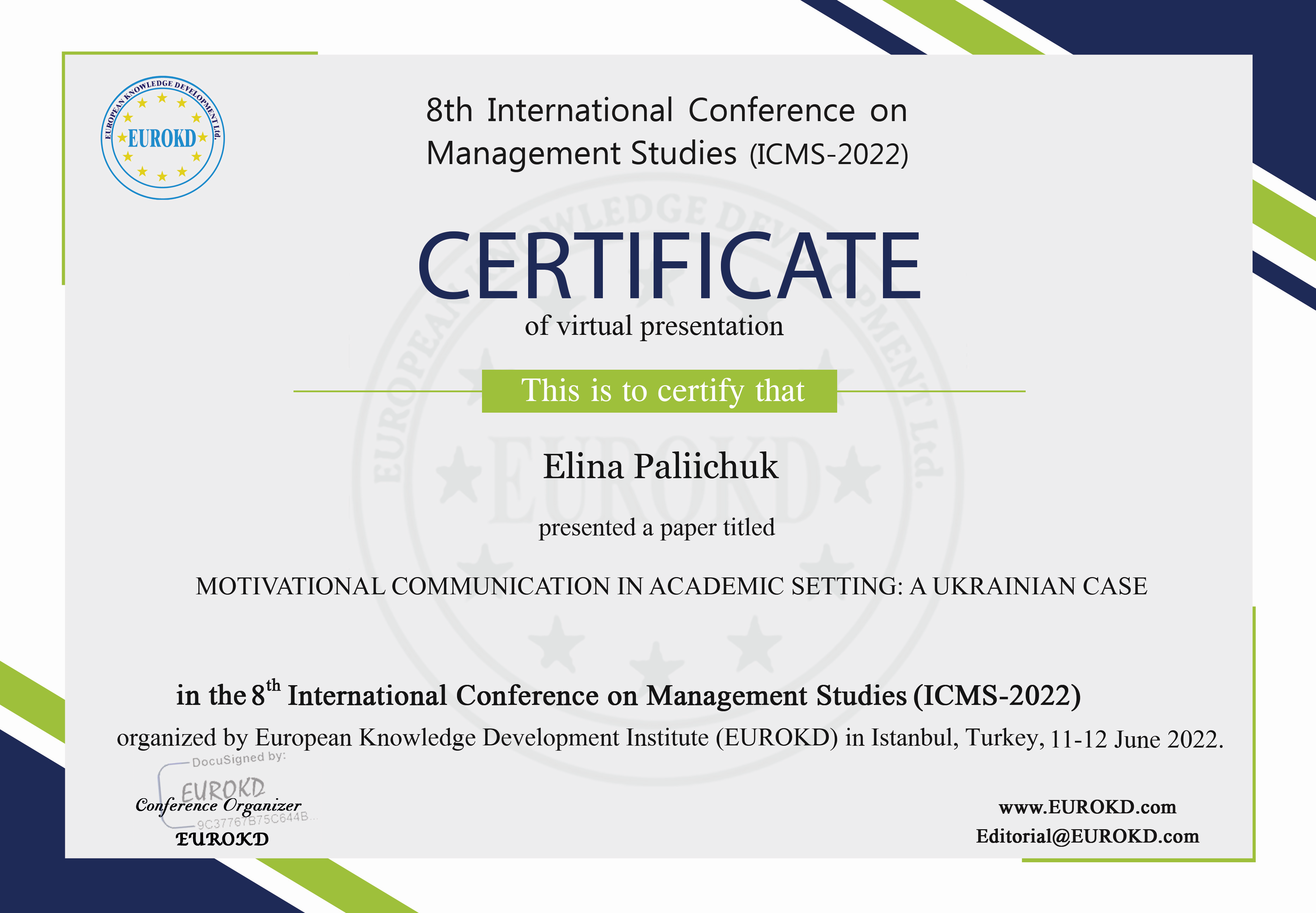 | 8122 | 8th International Conference on Management Studies (ICMS) | Motivational Communication in Academic Setting: A Ukrainian Case | Istanbul, Turkey |